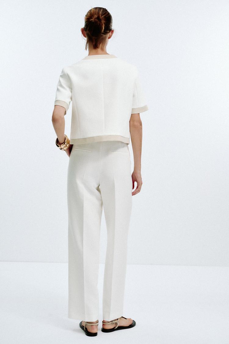 Blazer avec col rond et manches courtes. Poches avant passepoilées. Fermeture boutonnée sur le devant.