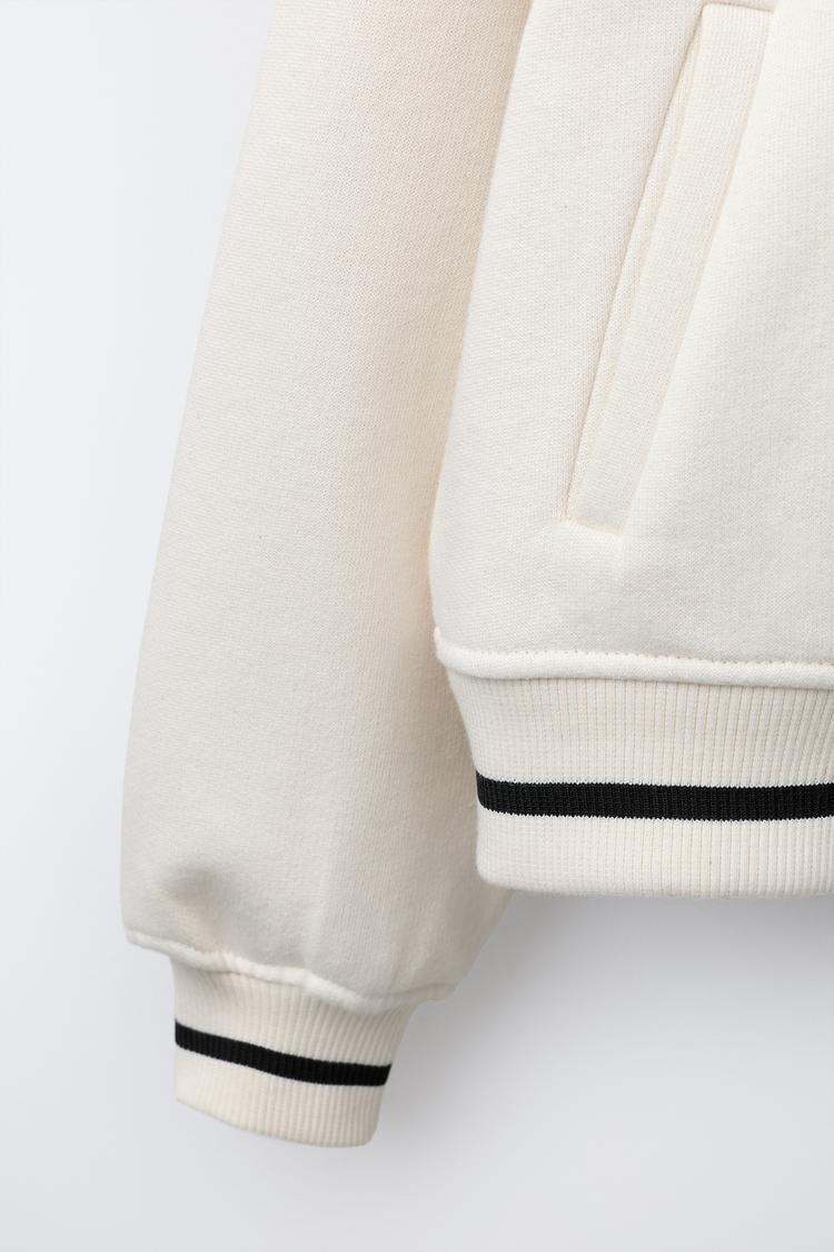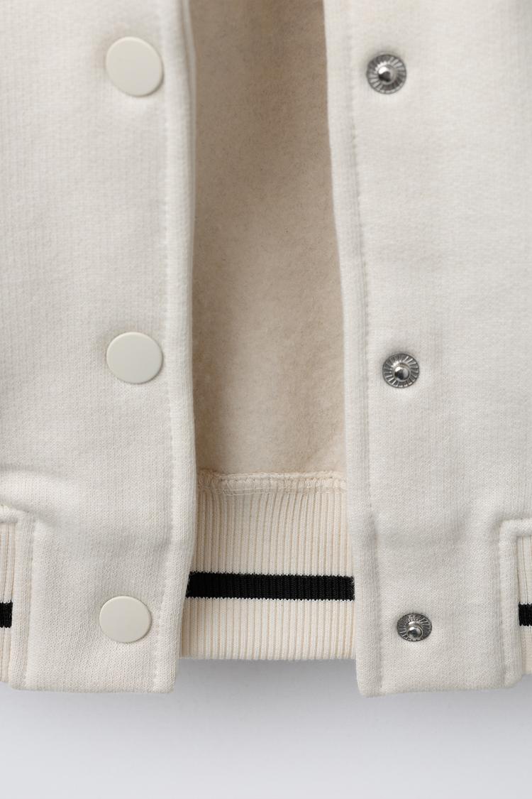 Blouson bomber en molleton avec col montant et manches longues. Finitions côtelées. Fermeture par boutons-pression sur le devant. Poches avec détail passepoilé sur le devant. Application pièce lettre en velours bouclé sur la poitrine et inscription floquée dans le dos. Intérieur gratté de qualité, chaud et doux.