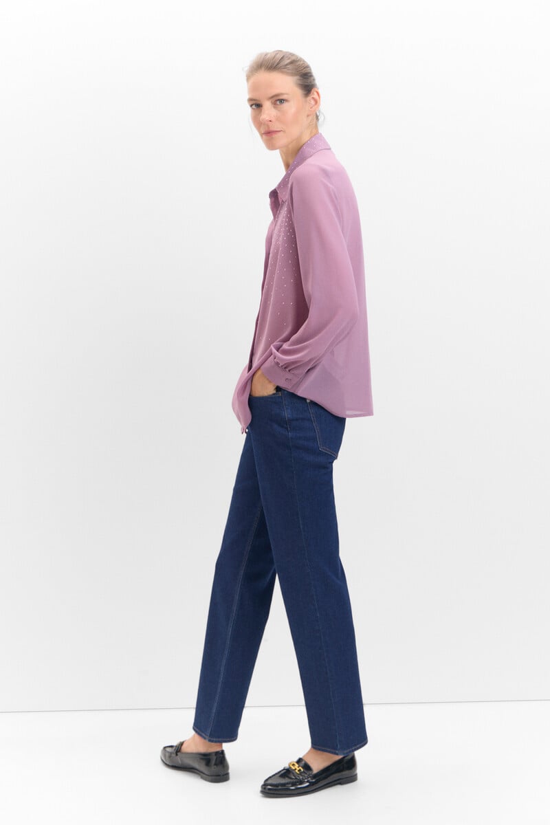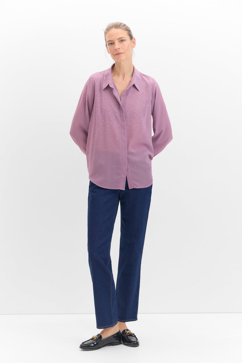 Chemise fluide en tissu léger ornée de strass en cascade. – Manches longues avec poignets boutonnés. – Col chemise.