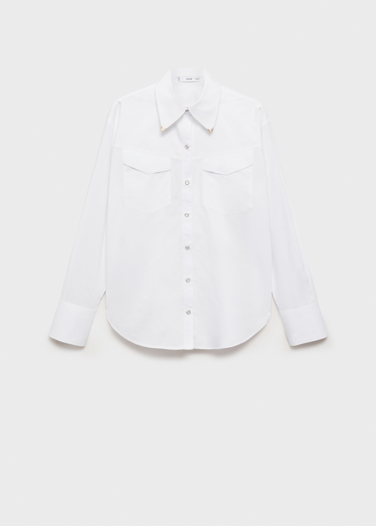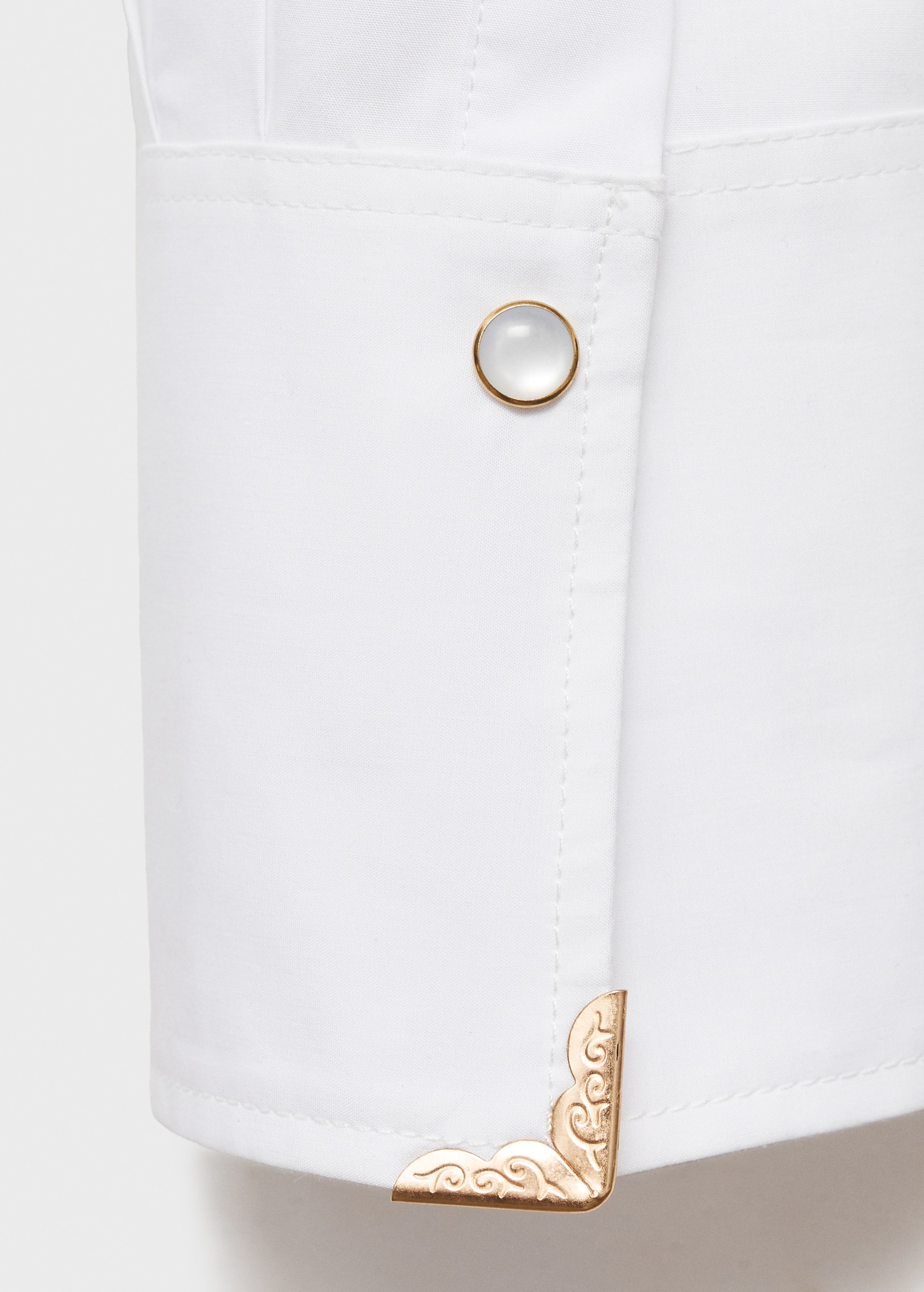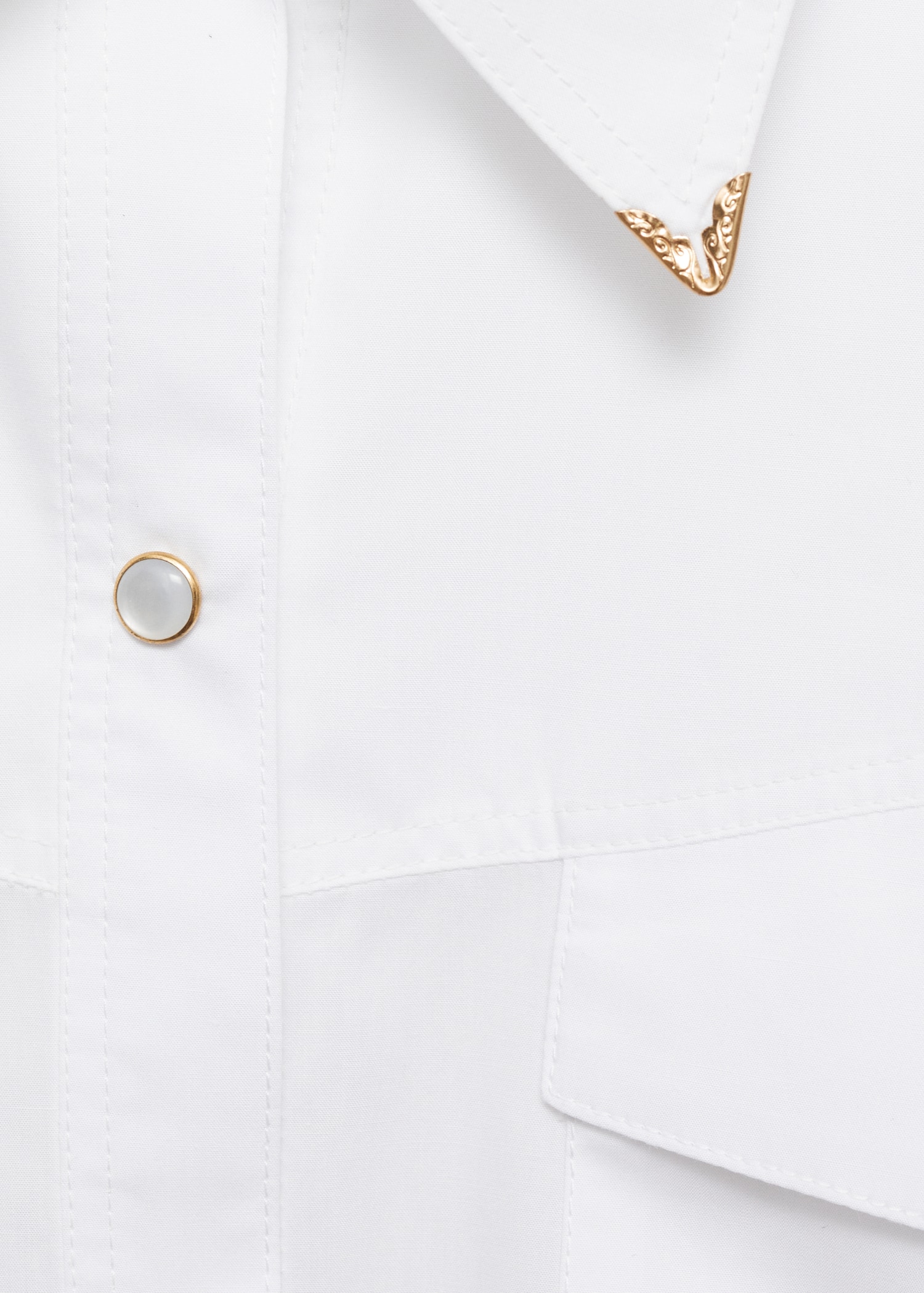 Tissu 100% coton. Design droit. Col chemise. Détail métallique. Manches longues boutonnées. Deux poches à rabat à l’avant. Fermeture à boutons sur le devant. Boutons effet bijou.