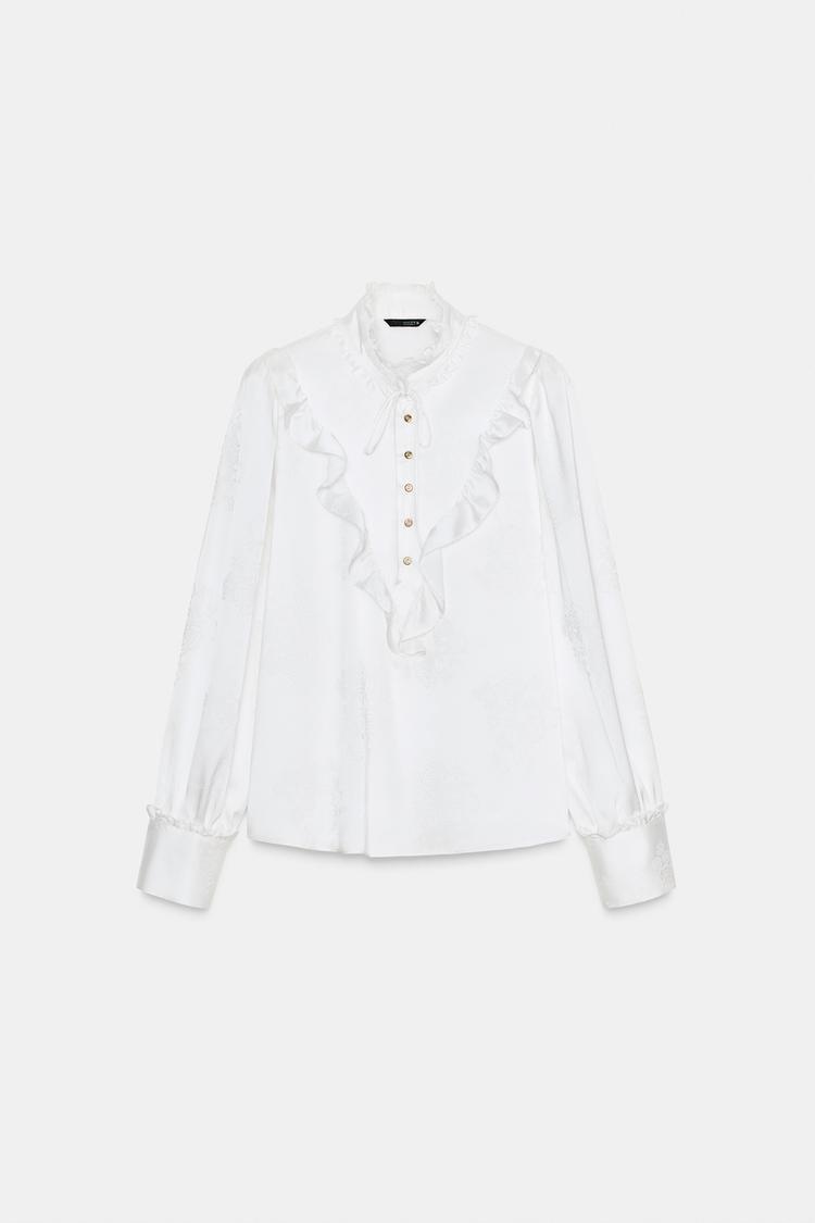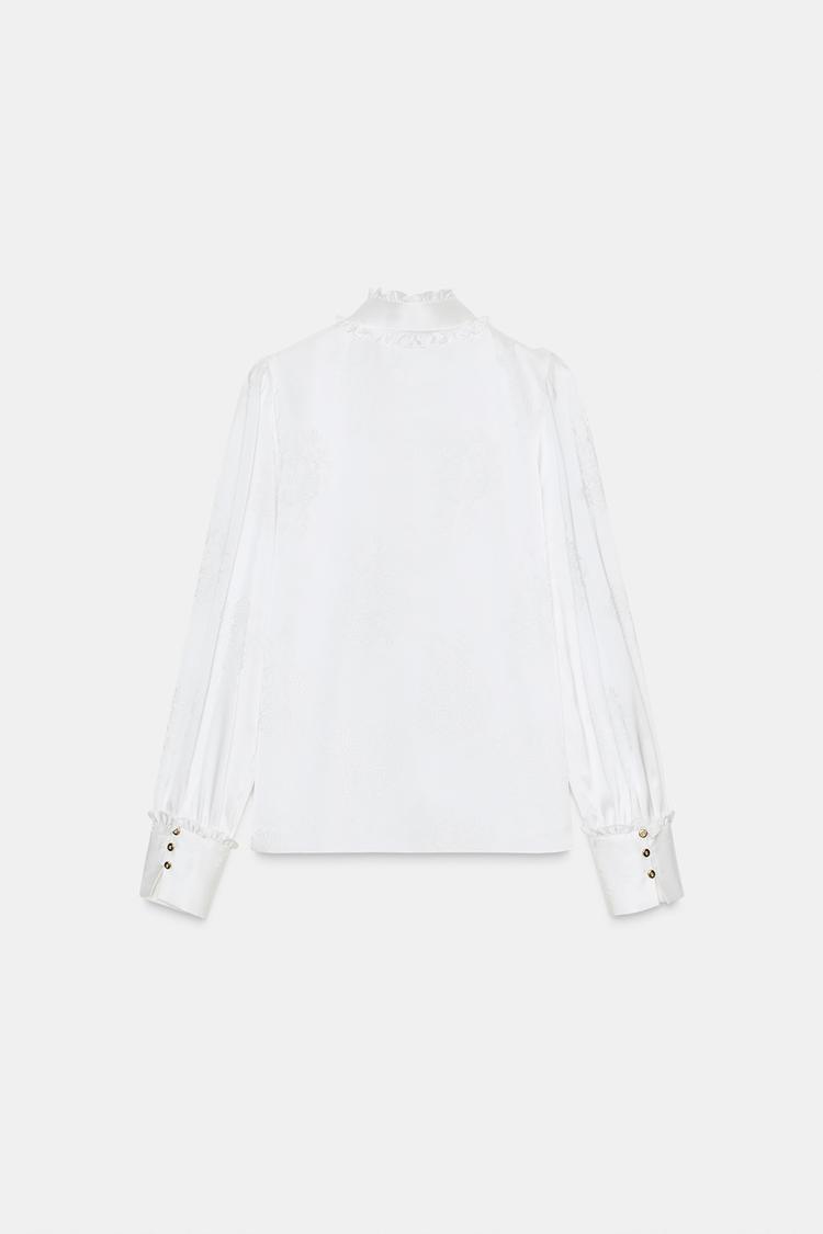 Chemisier à col montant et manches longues. Orné de volants. Fermeture par boutons et lien sur le devant.