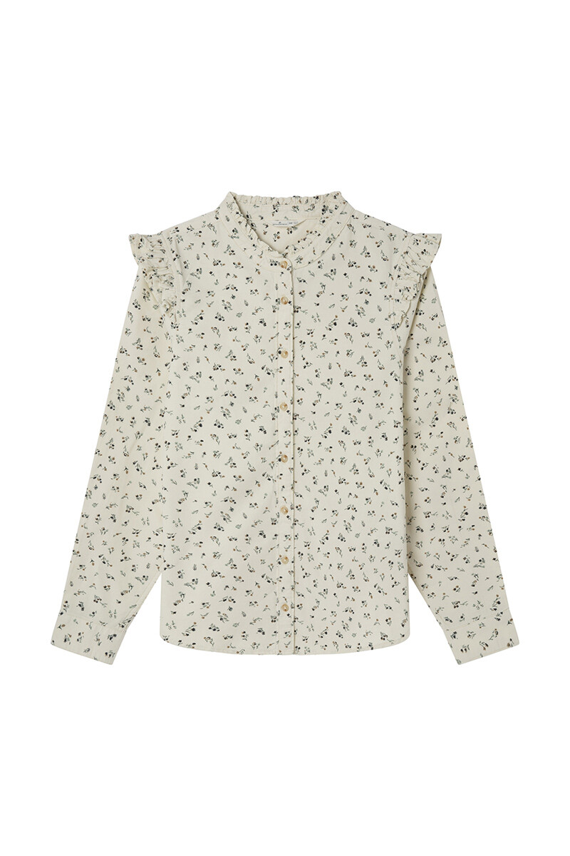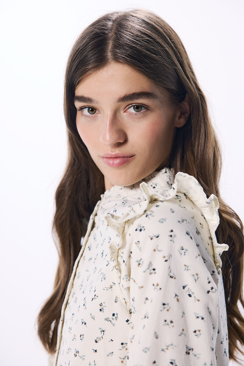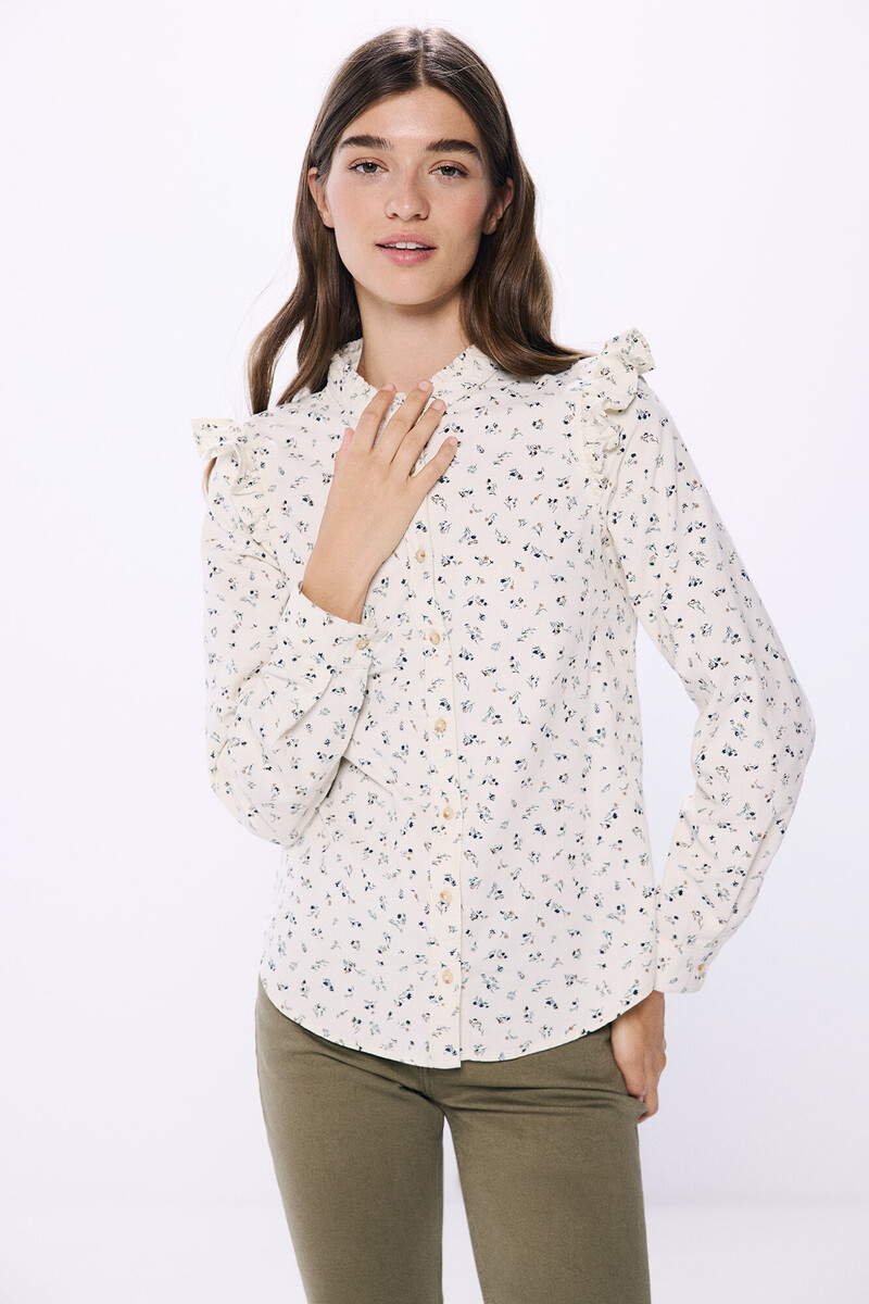 Chemisier à manches longues avec col rond, volants aux épaules, boutons sur le devant et imprimé floral.