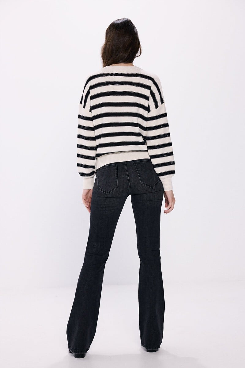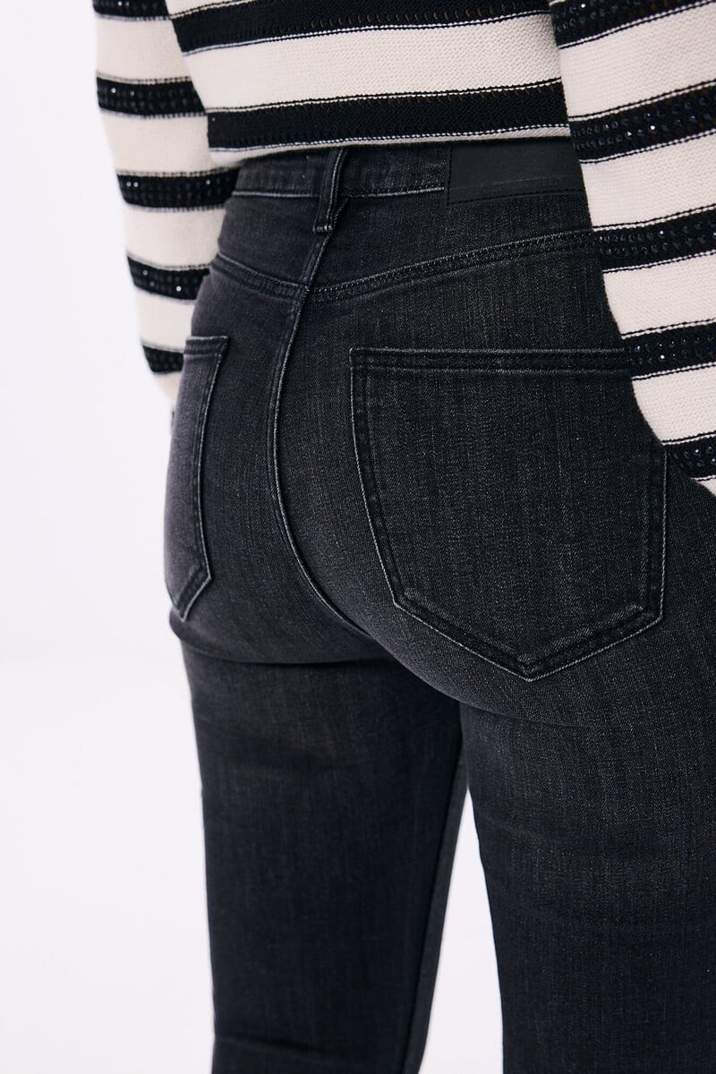 Jean taille haute, avec poches sur le devant et à l’arrière, avec fermeture boutonnée et zippée, avec une jambe évasée à partir du genou. Un processus de lavage utilisant de nouvelles technologies a été utilisé dans ces jeans, réduisant ainsi la consommation d’eau, de produits chimiques et d’énergie.