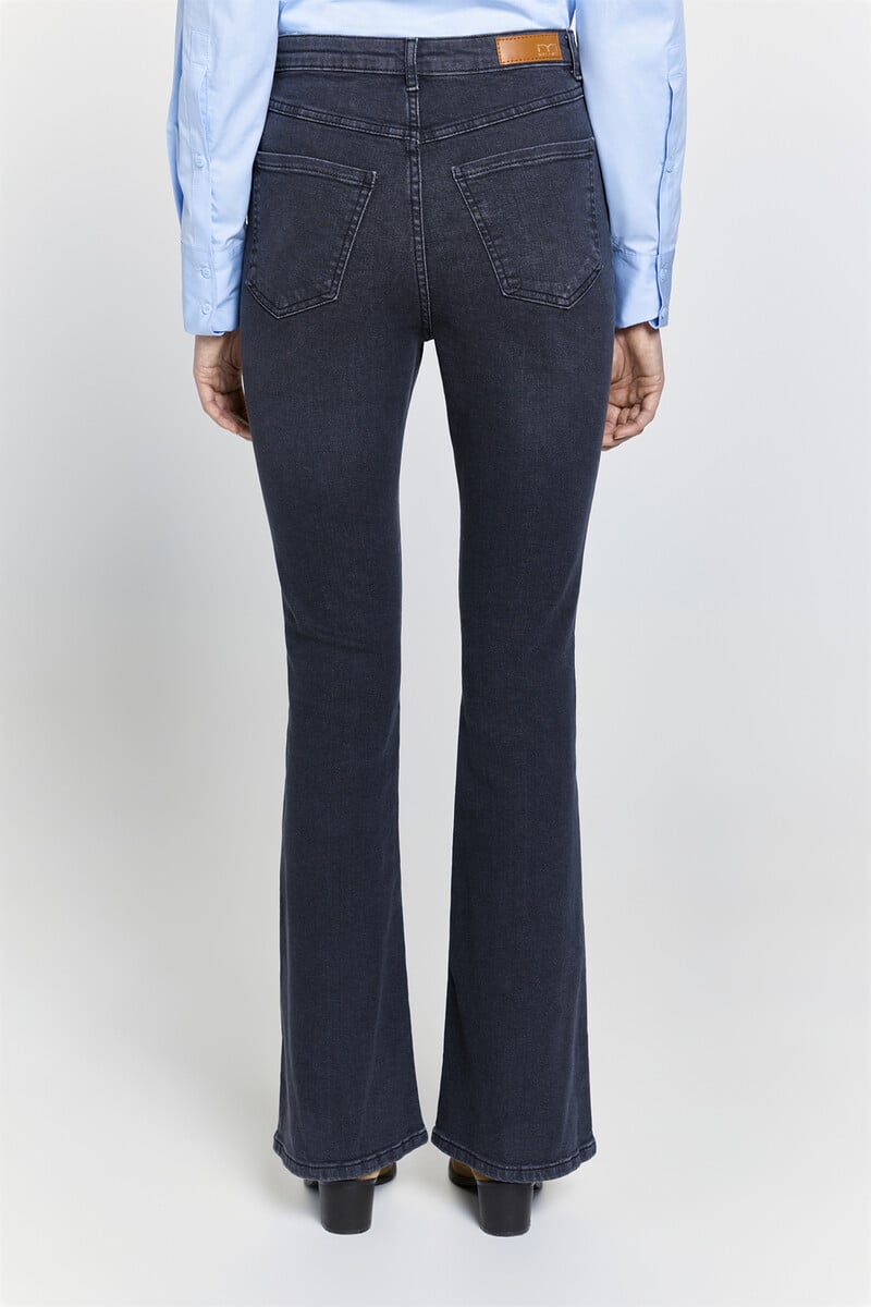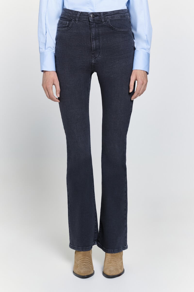 – Jean taille haute avec passants de ceinture et cinq poches.