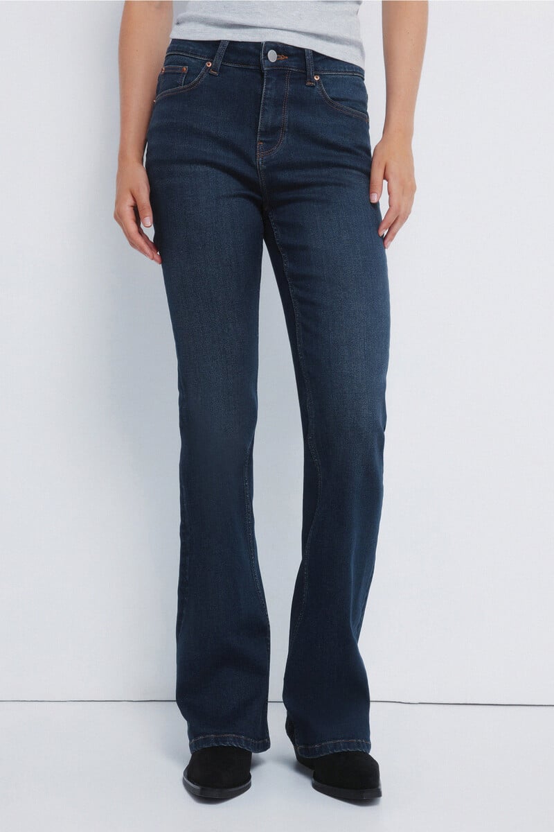 Jean taille mi-haute avec poches avant et arrière, fermeture à bouton et à glissière et jambe évasée.