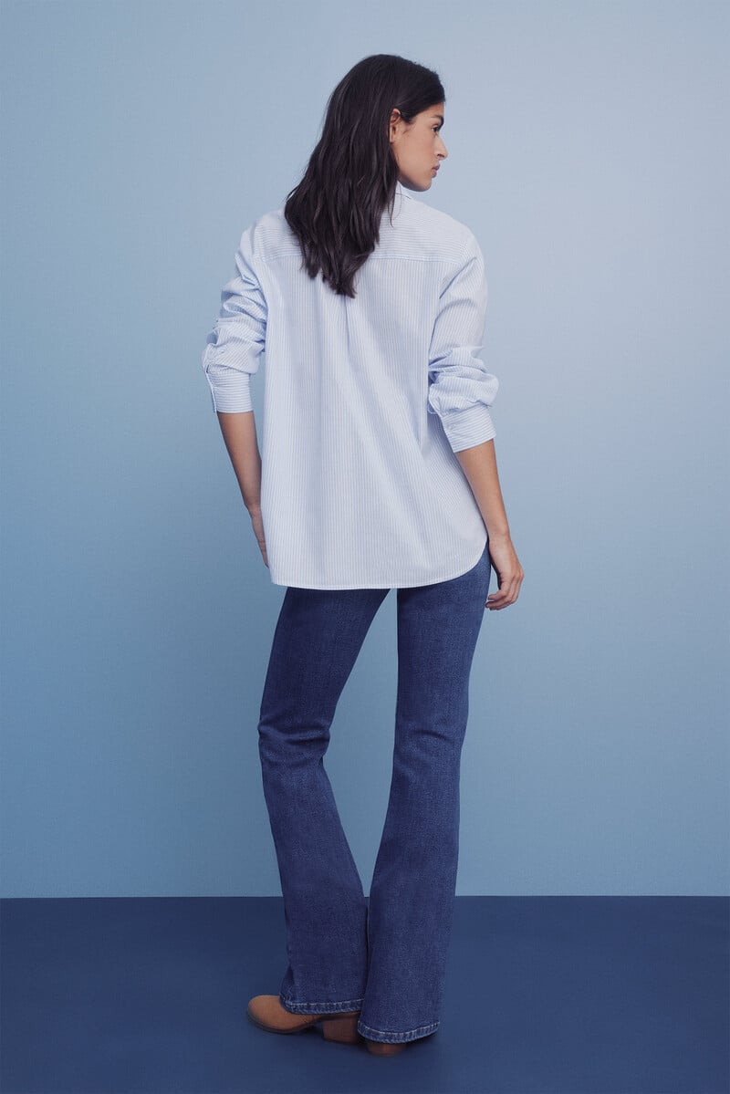 Jean taille mi-haute avec poches avant et arrière, fermeture à bouton et à glissière et jambe évasée.