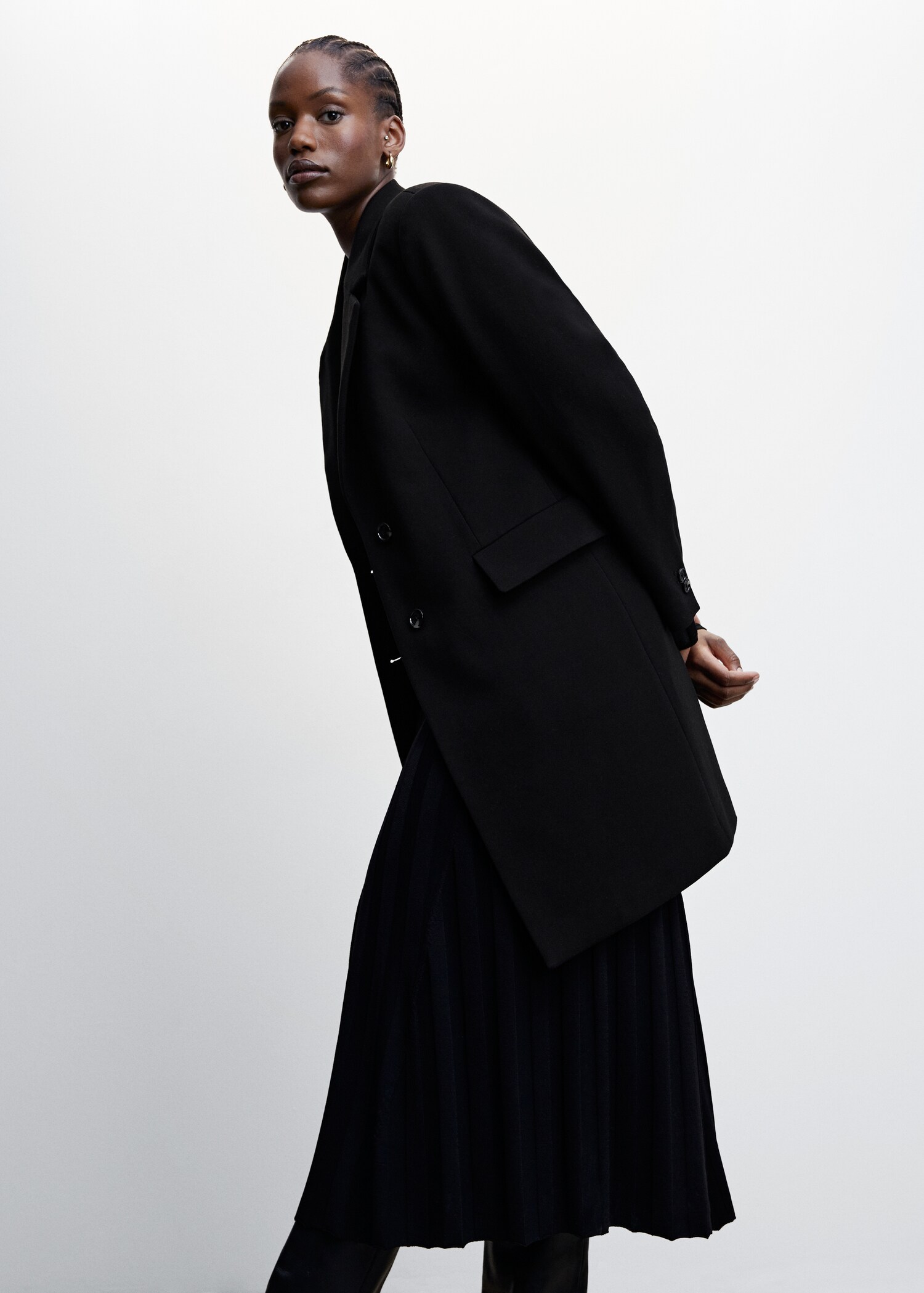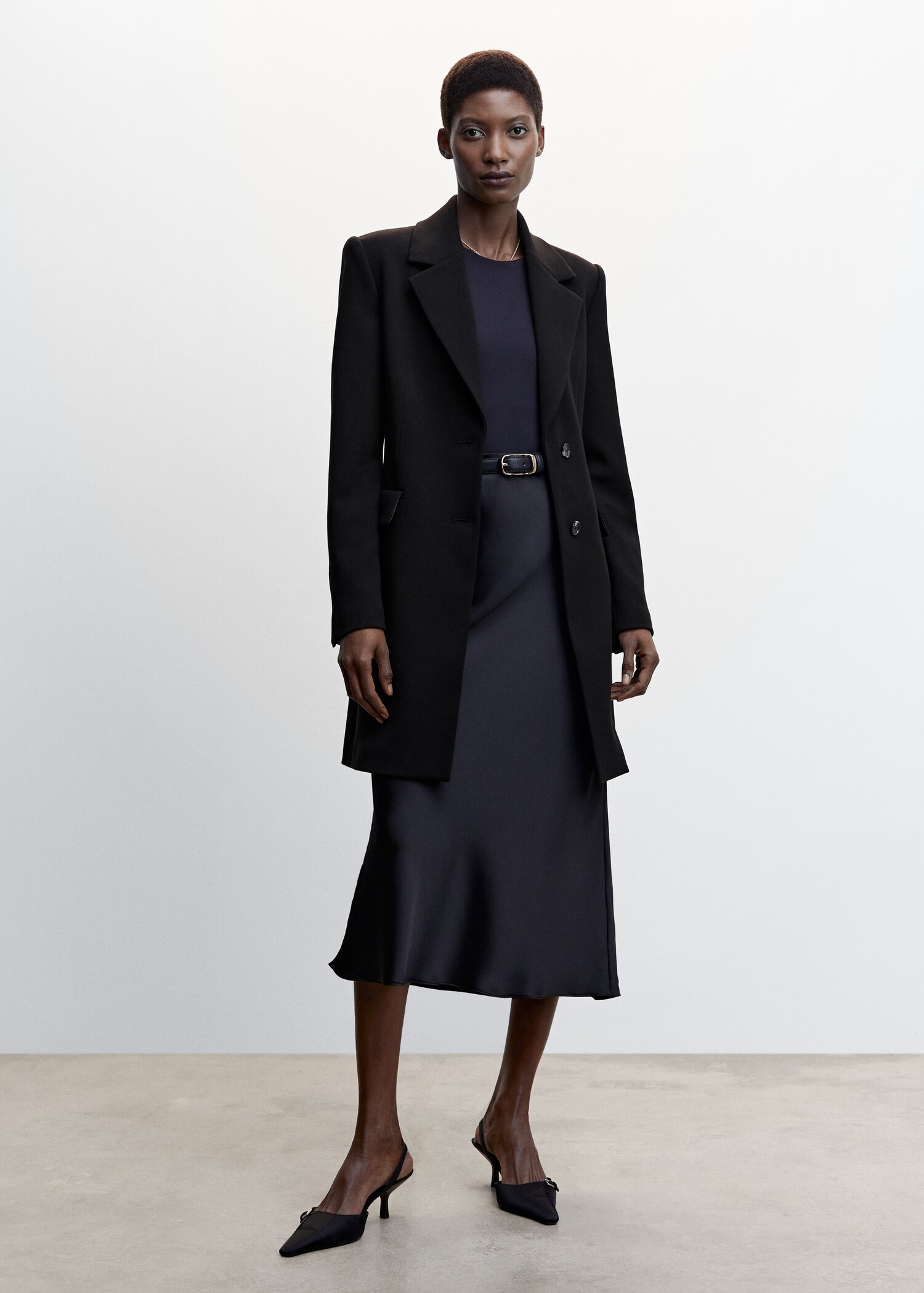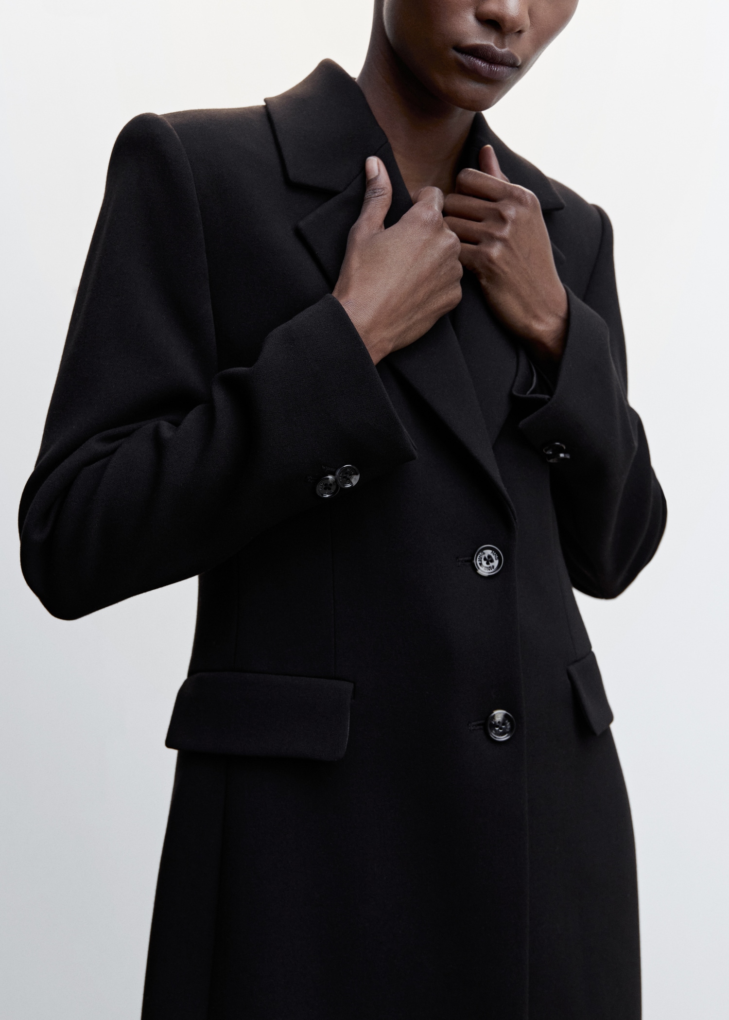 Tissu mélange de laine . Design croisé. Coupe droite. Col en V avec rabat. Revers crantés. Manche longue. Deux poches à rabat sur le devant. Fermeture à boutons sur le devant. Doublure. Disponible Plus. Looks de bureau