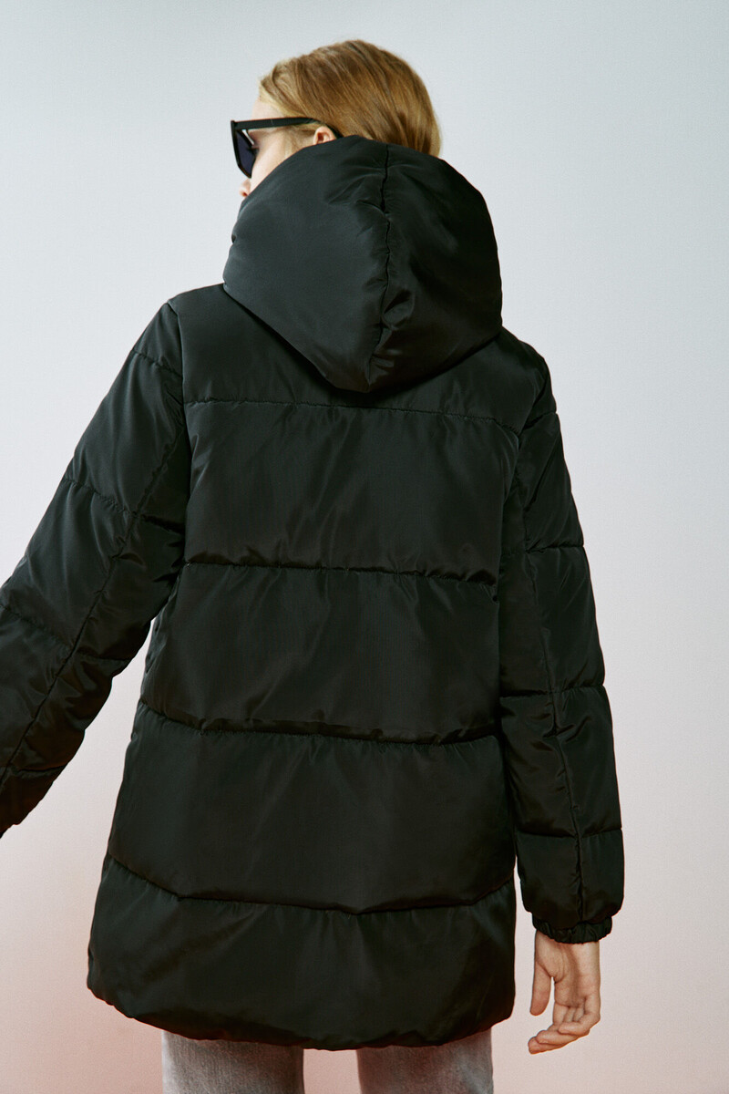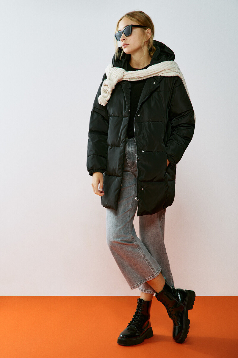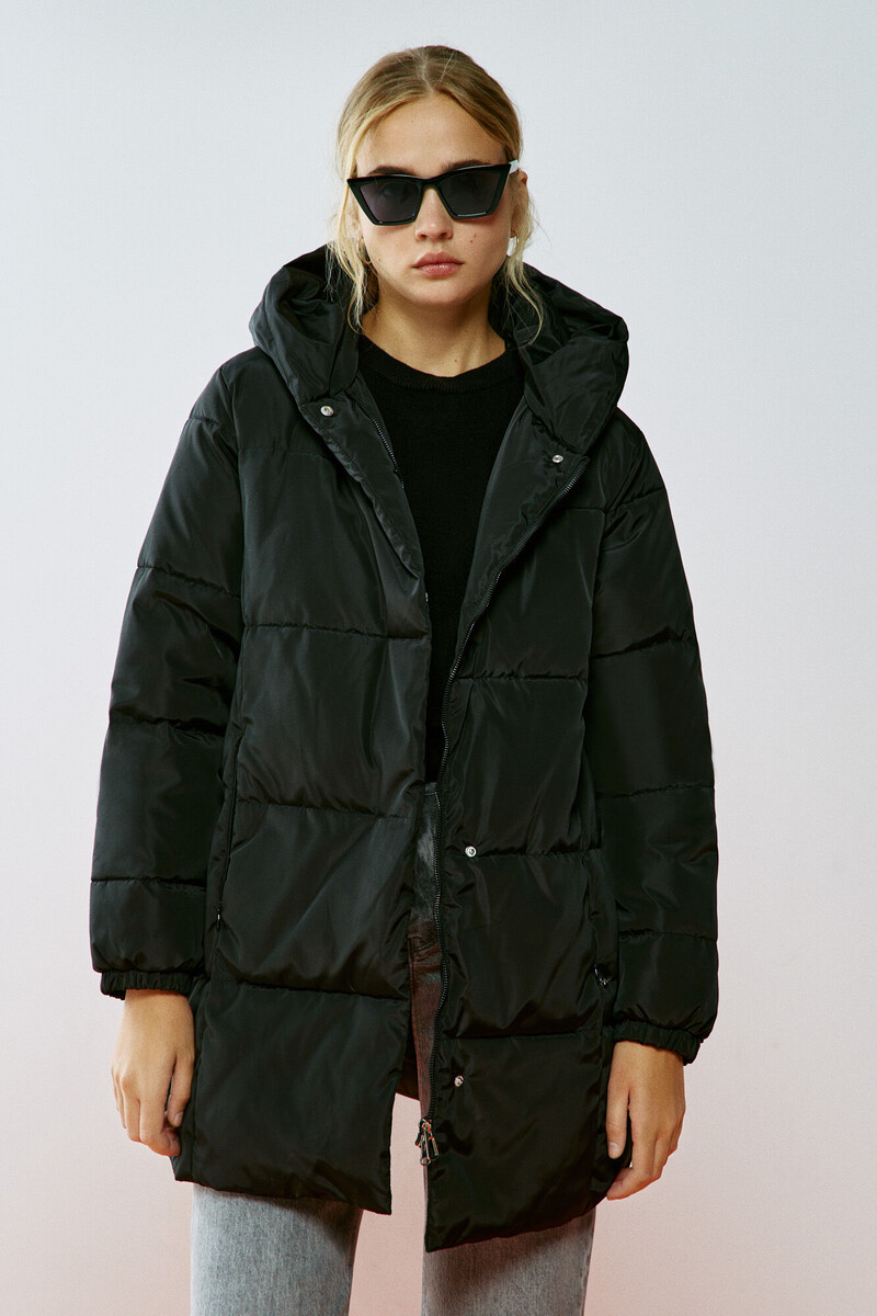 Manteau moyen à capuche avec poches latérales, fermeture éclair à double sens avec patte de boutonnage, garnissage en duvet et