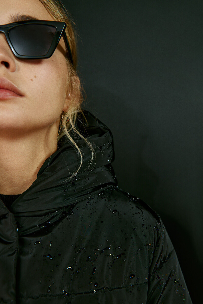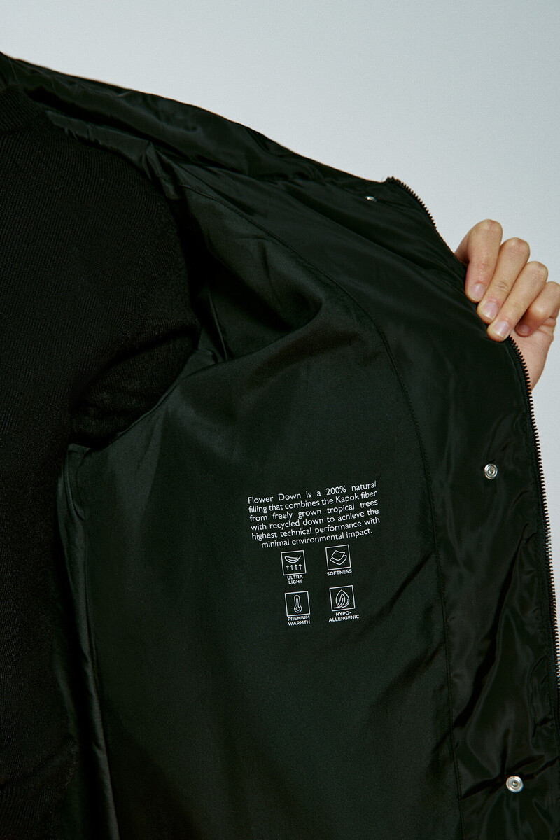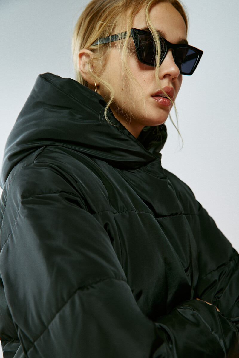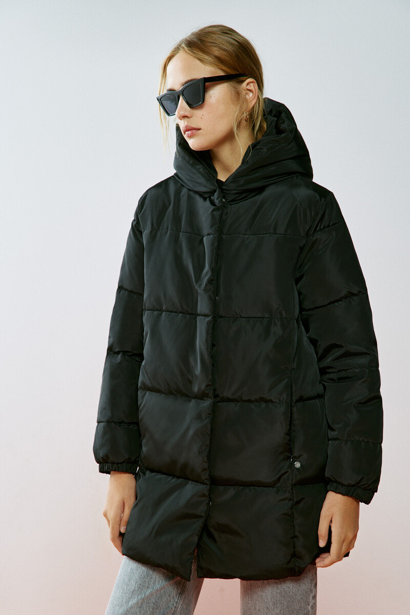 Manteau moyen à capuche avec poches latérales, fermeture éclair à double sens avec patte de boutonnage, garnissage en duvet et