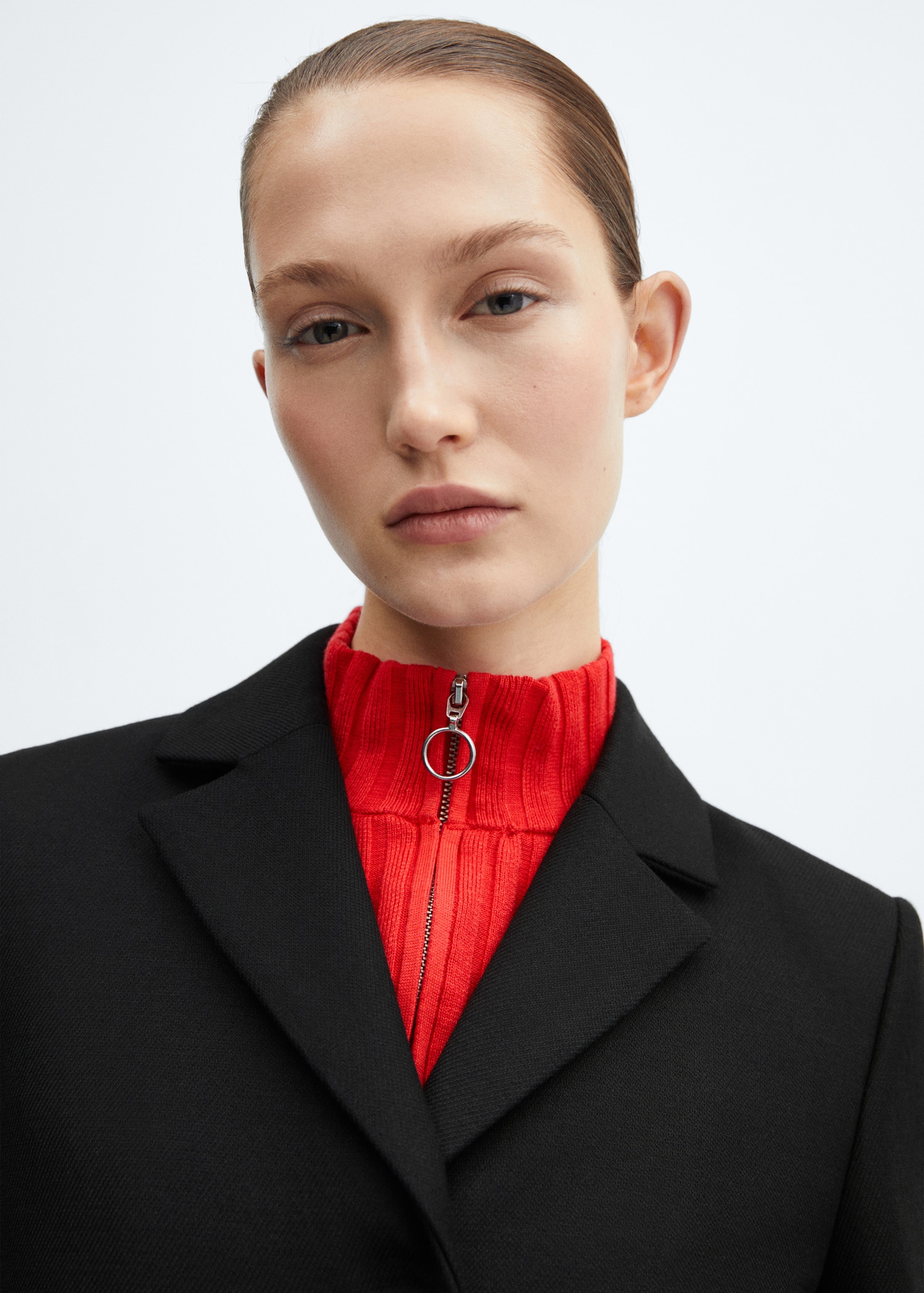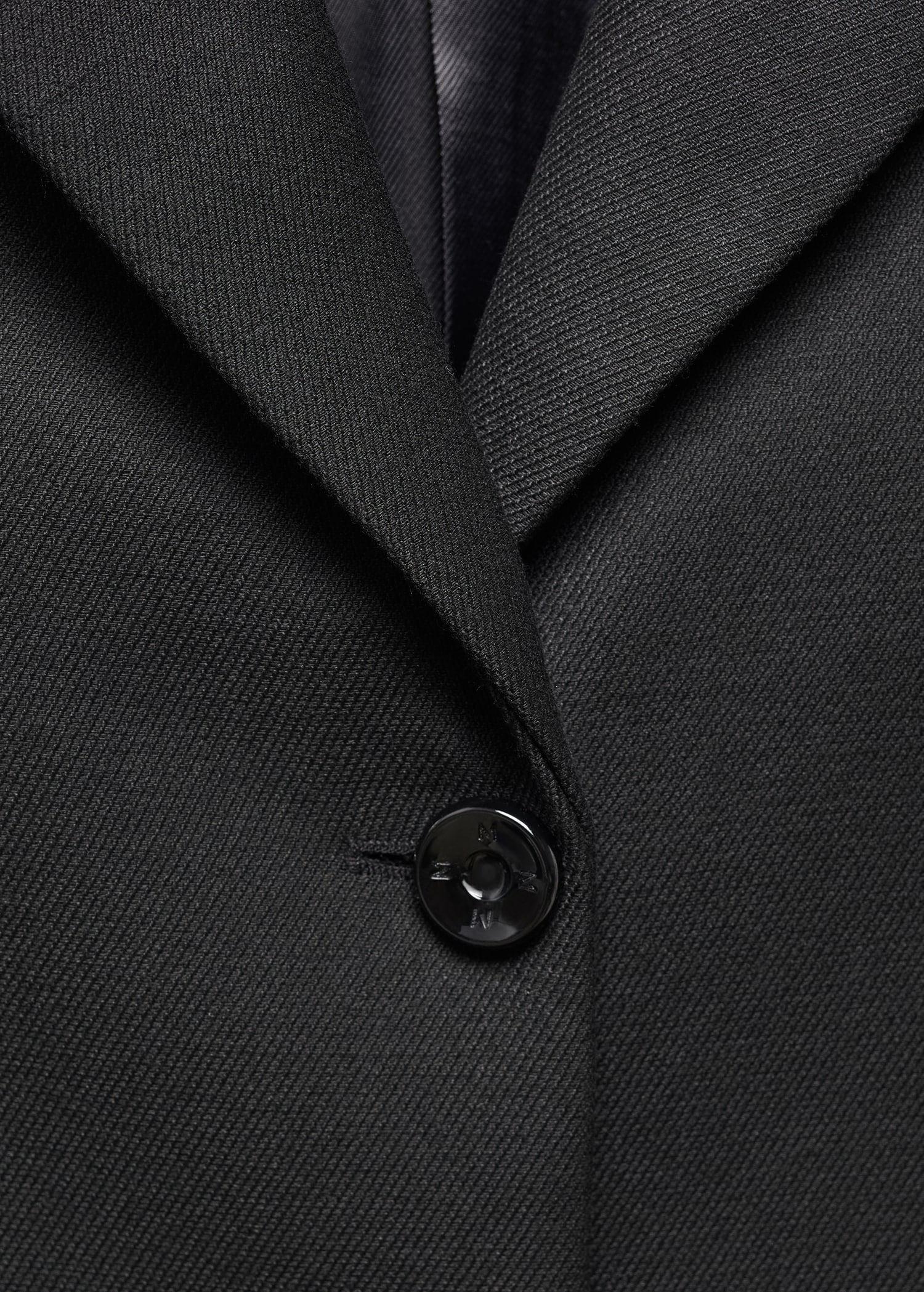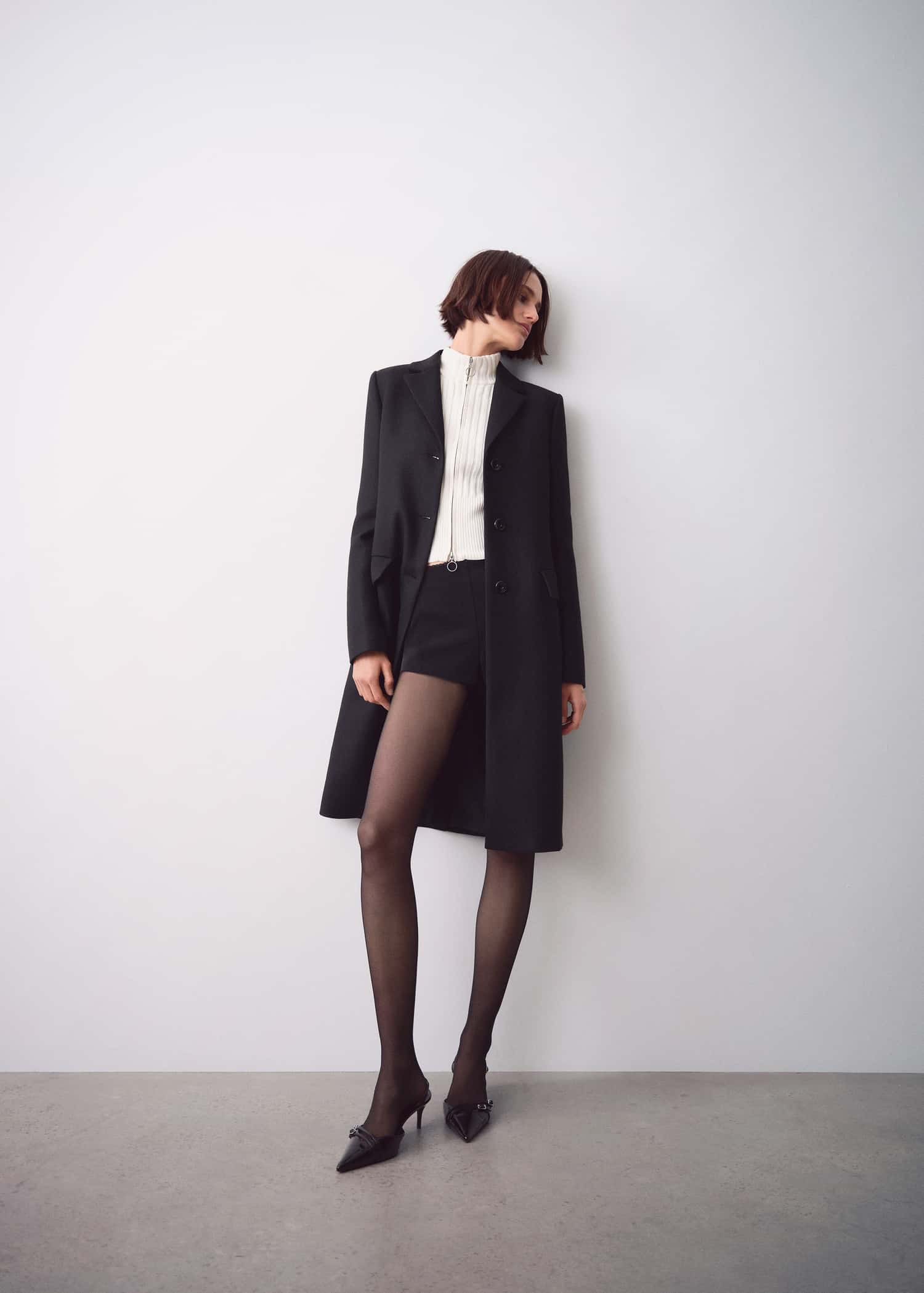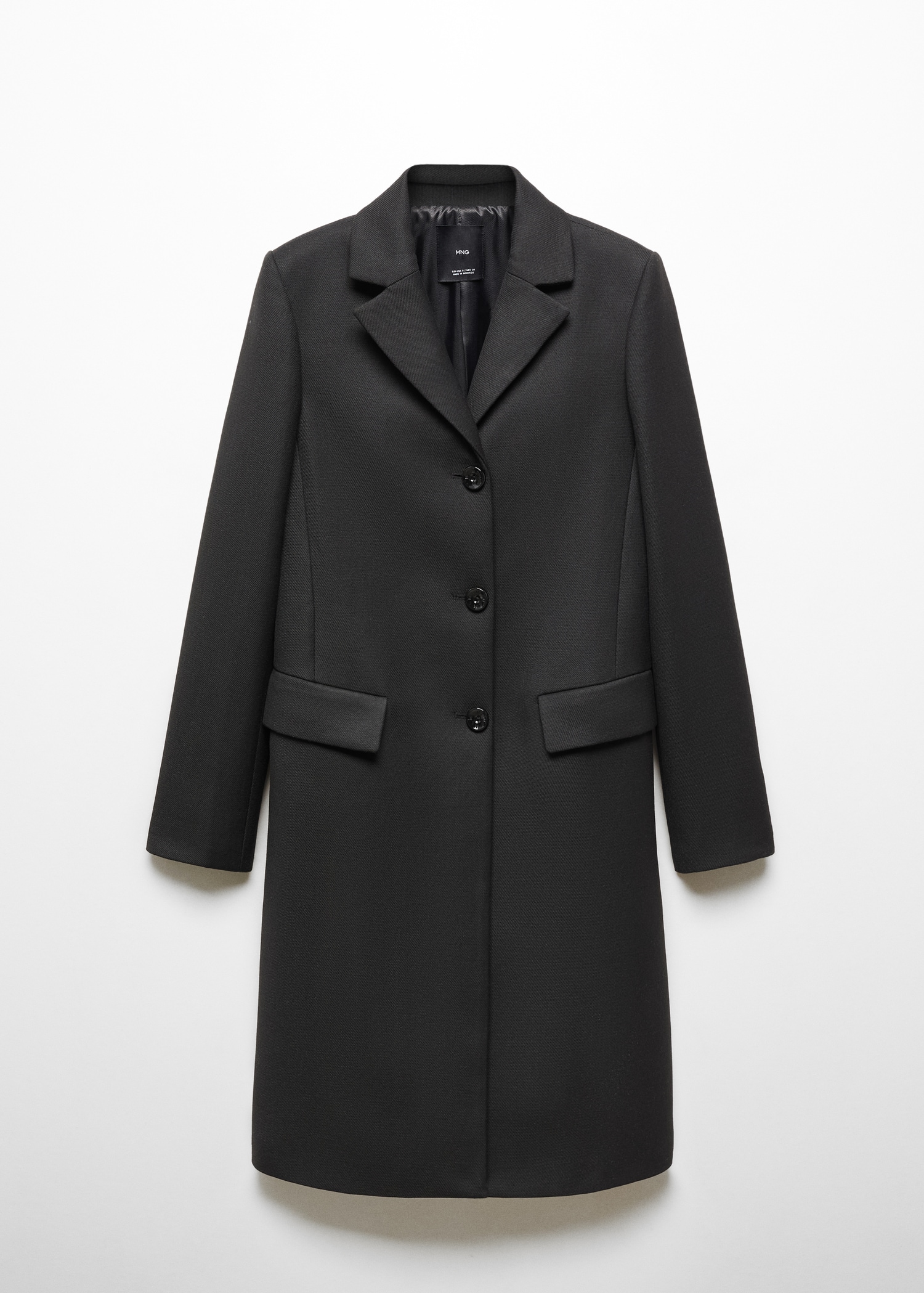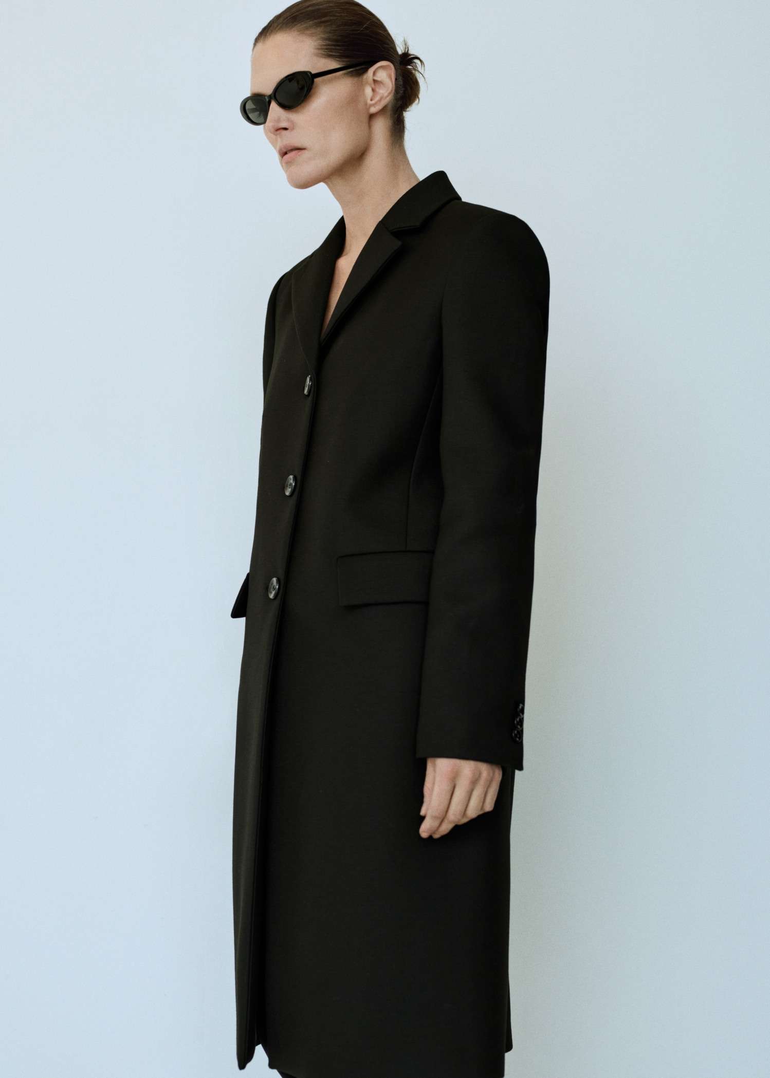 Tissu en mélange de coton. Coupe midi. Design droit. Col en V avec rabat. Revers crantés. Manche longue. Deux poches passepoilées et à rabat sur le devant. Coutures décoratives. Doublure. Fermeture avant avec boutons.