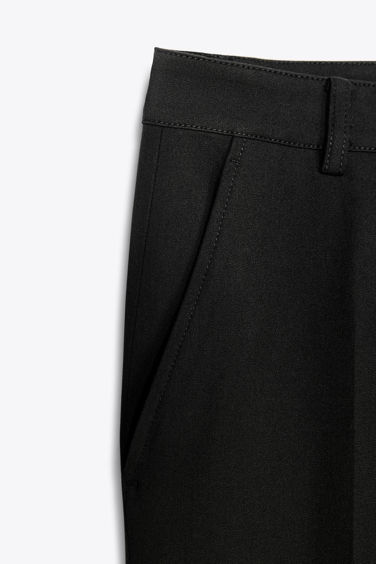 Pantalon confectionné en filature de viscose. Taille normale et taille avec passants. Poches latérales. Détail de rayure repassée sur le devant. Fermeture devant avec zip, bouton et crochets métalliques.