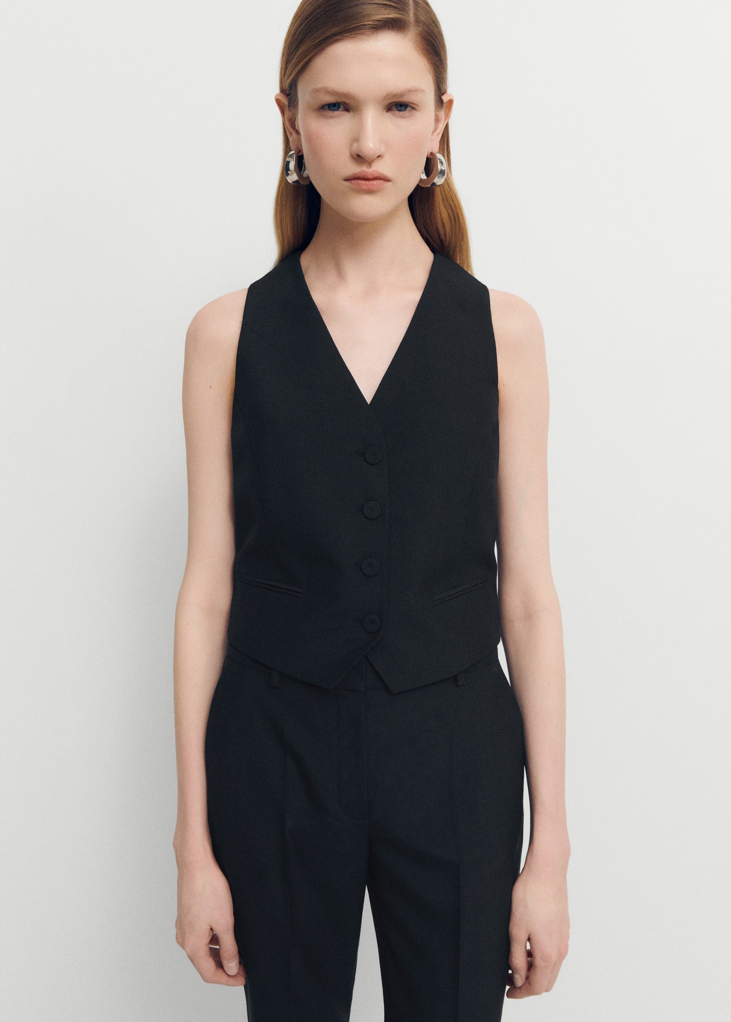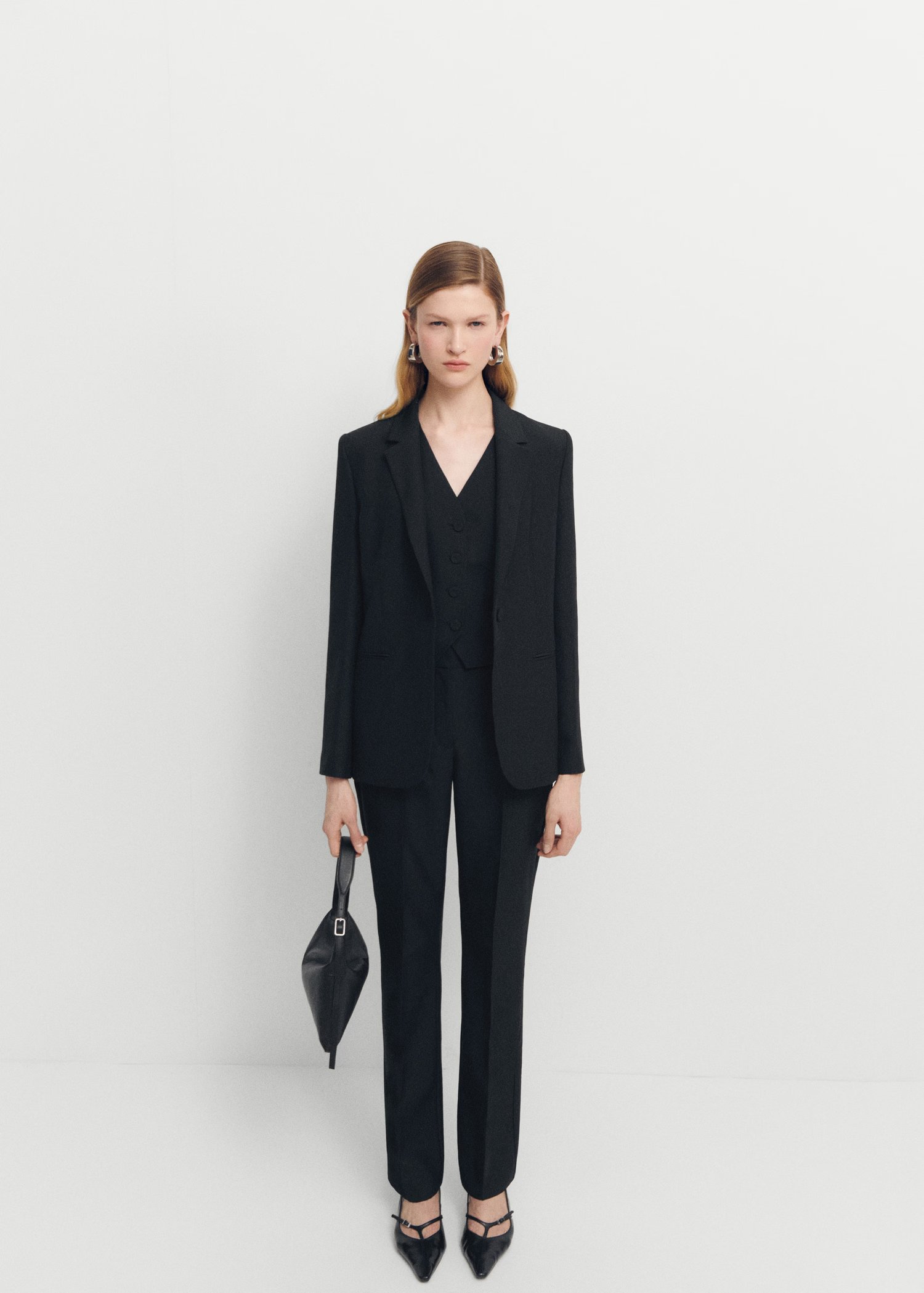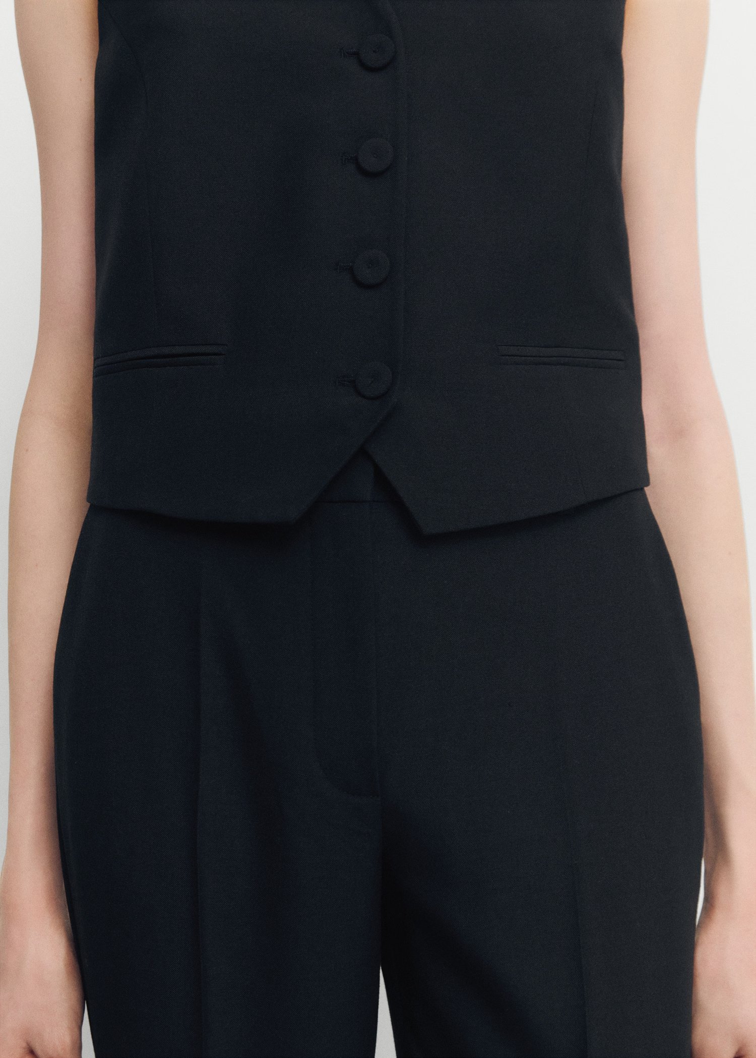 Tissu de laine mélangé. Design droit. Style tailleur. Taille haute. Passants de ceinture. Deux poches latérales. Deux poches passepoilées à l’arrière. Fermeture Éclair avec agrafe et bouton dissimulés. Doublure