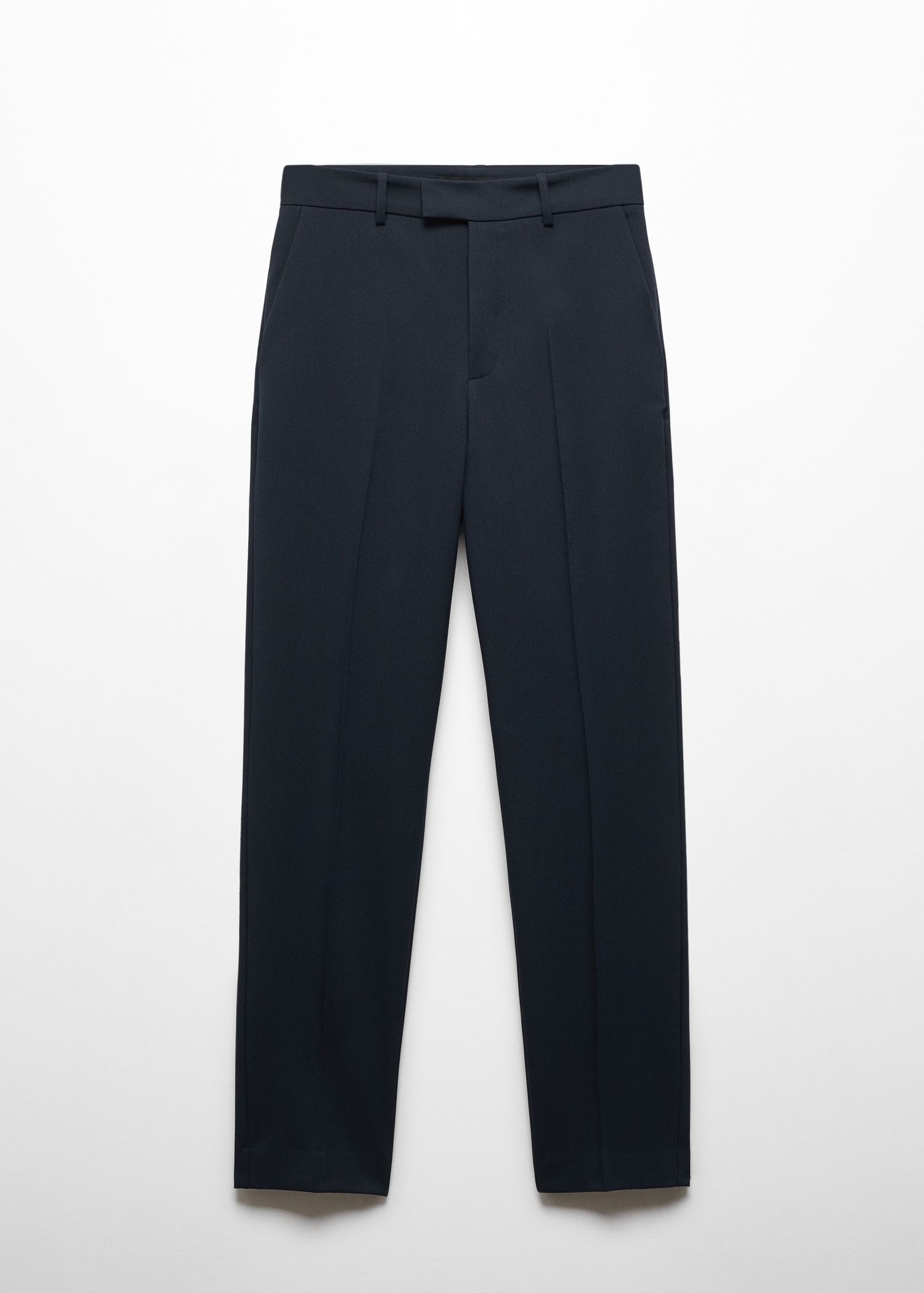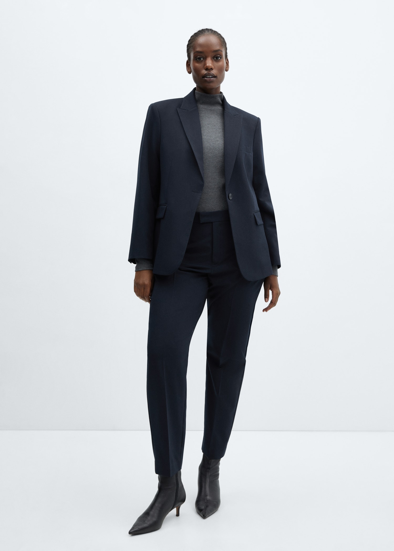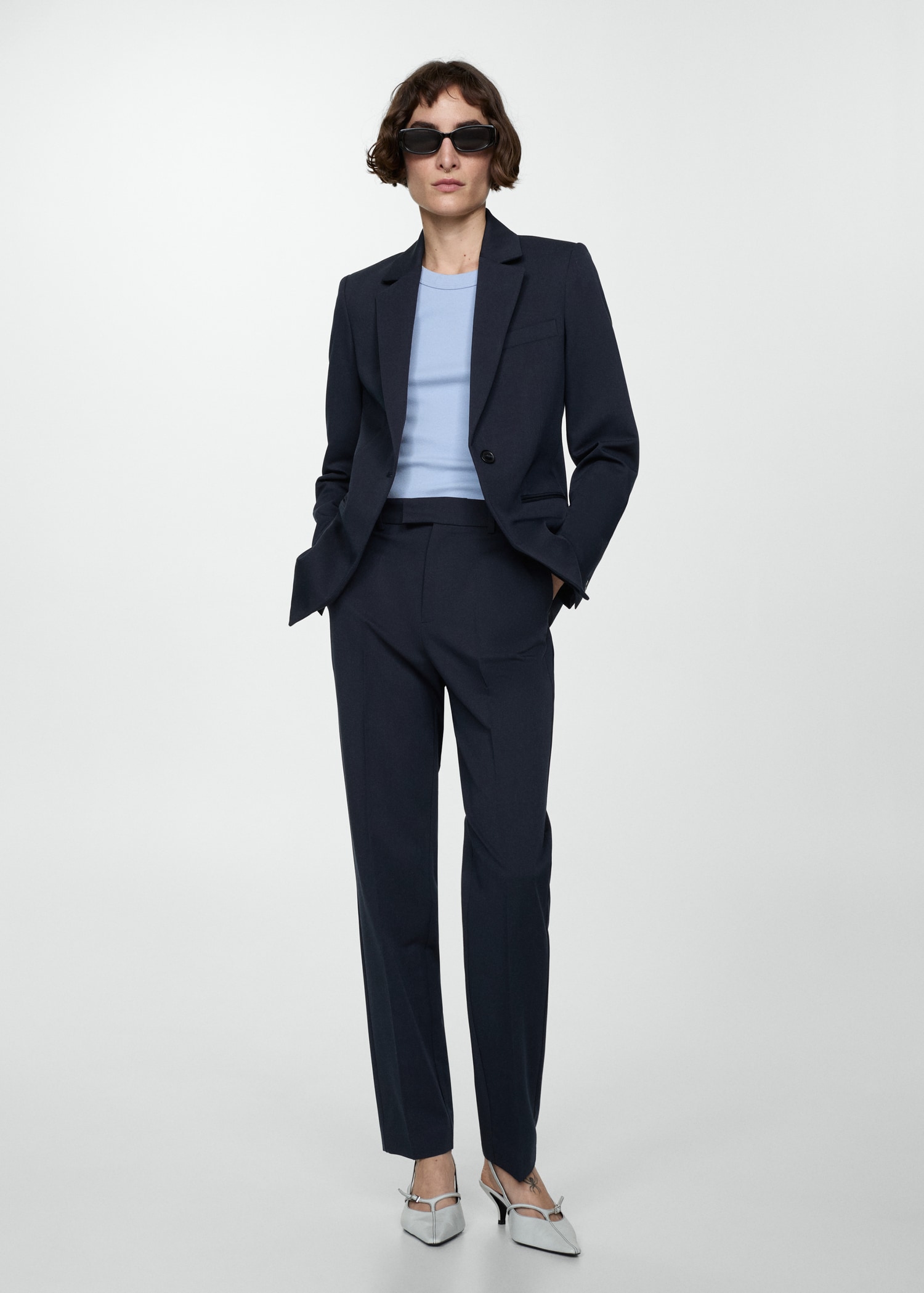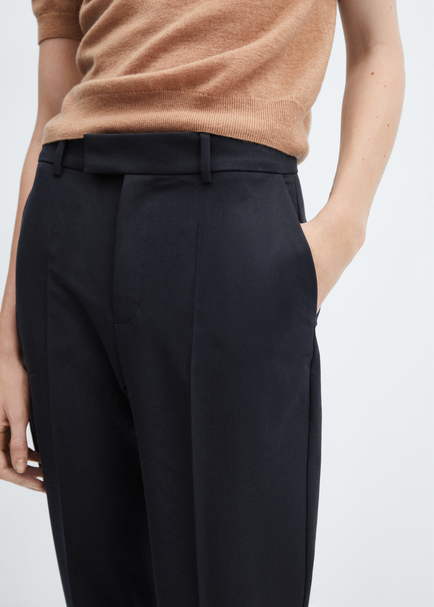 Coupe standard. Coupe droite. Style tailleur. Taille mi-haute. Passants de ceinture. Deux poches latérales. Deux poches passepoilées à l’arrière.