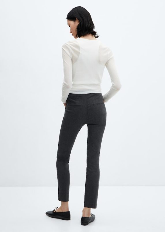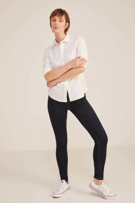 Tissu en mélange de coton. Design long. Design droit. Style crop. Taille mi-haute. Deux poches latérales. Fermeture Éclair avec agrafe et bouton dissimulés. Boutons effet bijou.