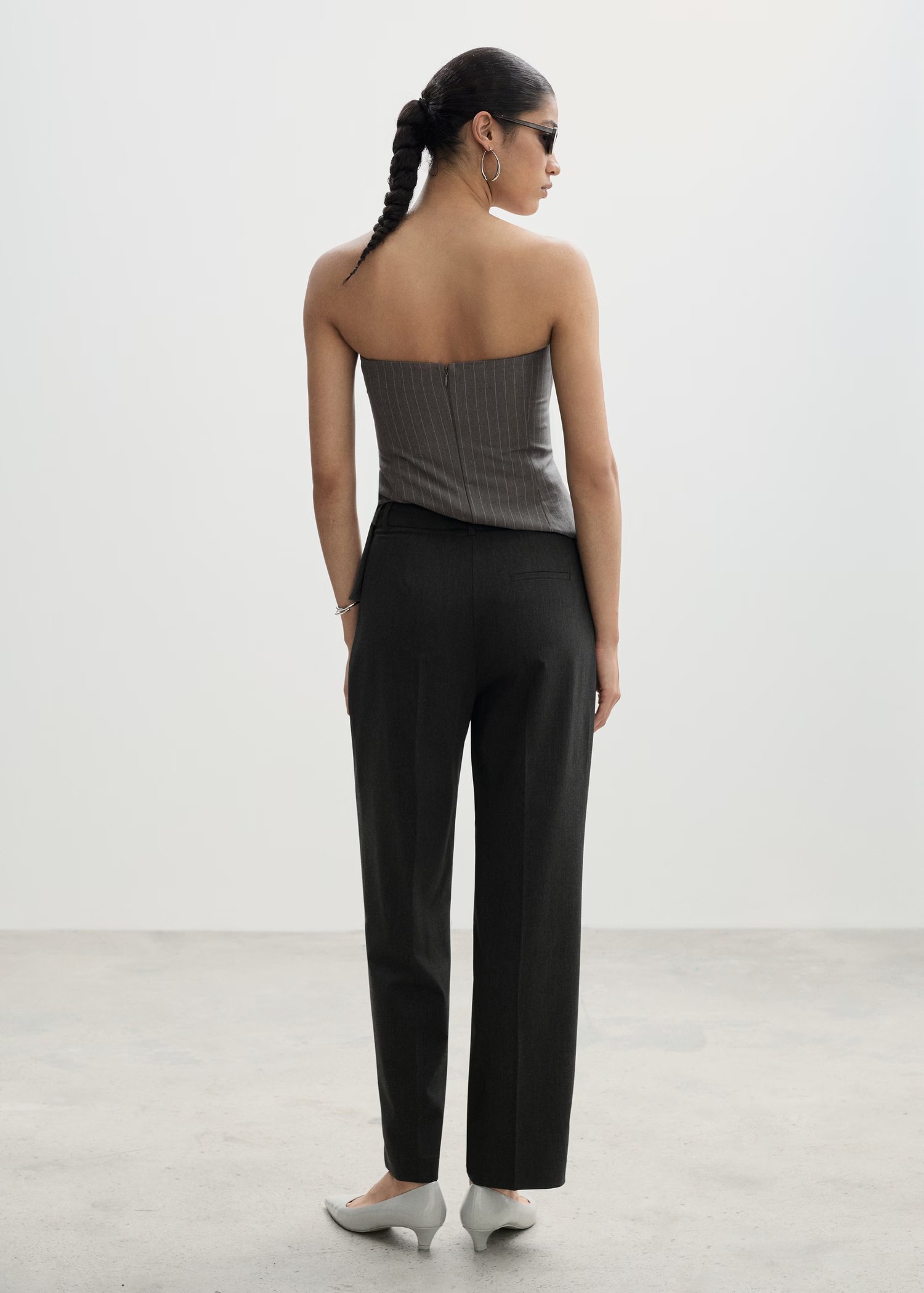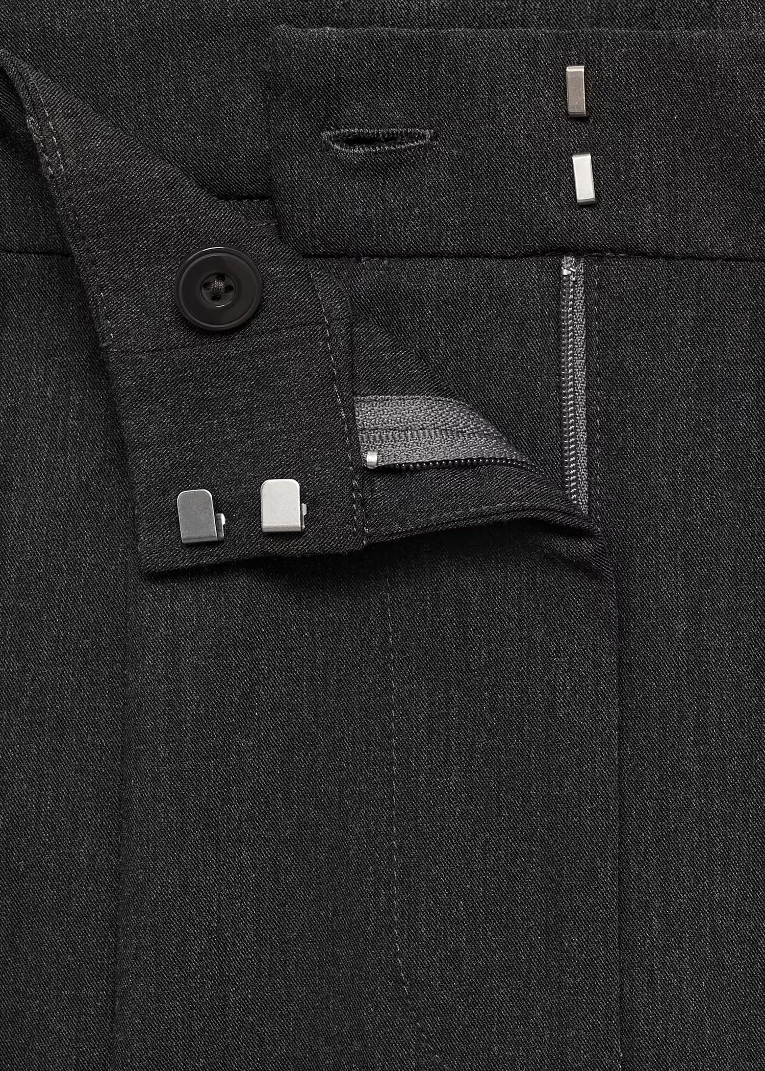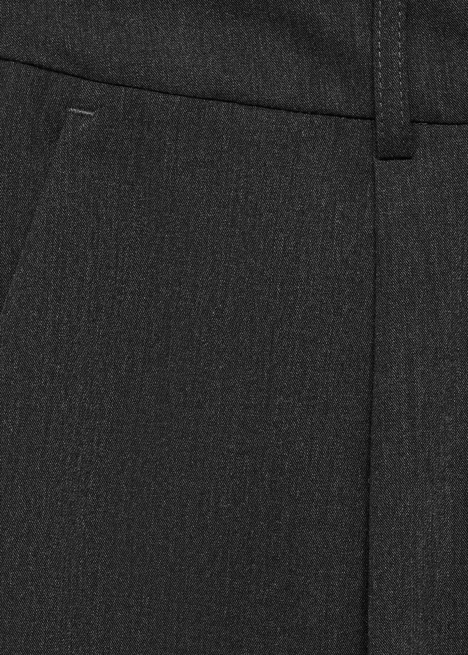 Design Droit. Design long. Taille mi-haute. Fermeture Éclair avec agrafe et bouton dissimulés. Passants de ceinture. Deux poches latérales. Pinces. Poche passepoilée à l’arrière.