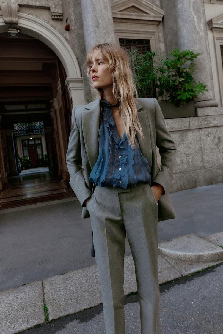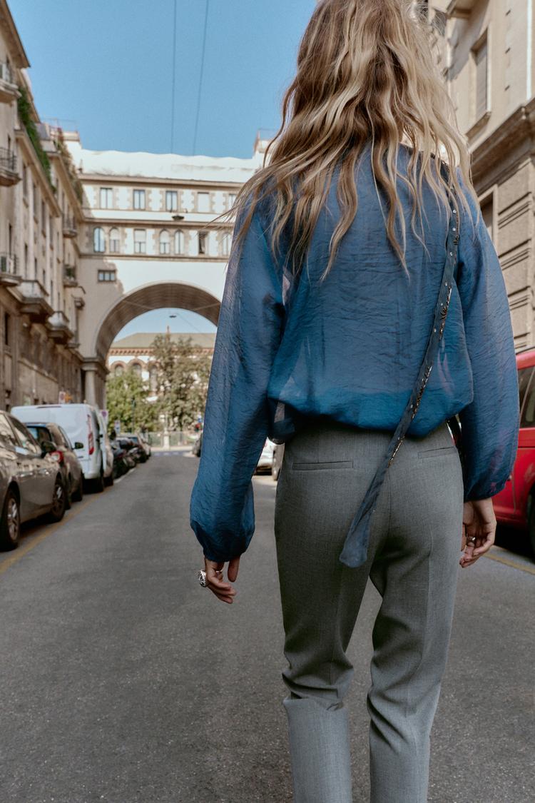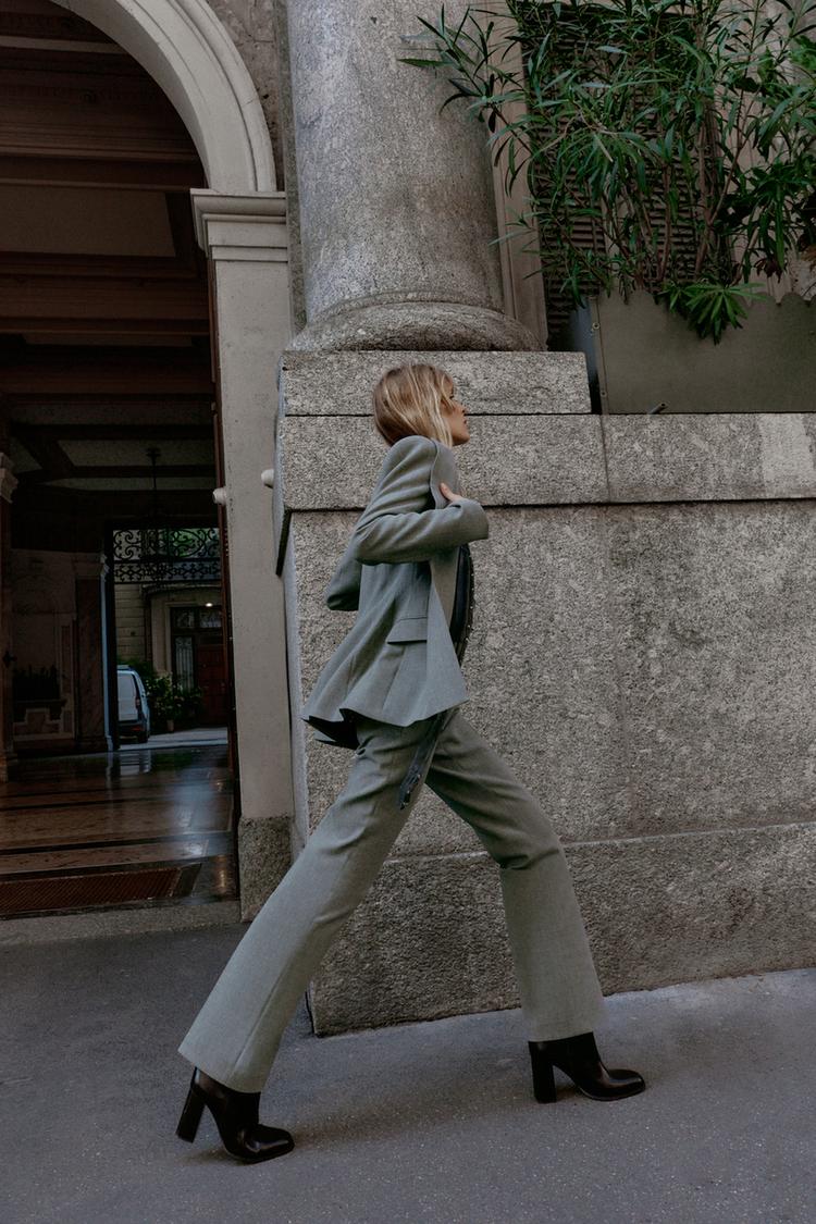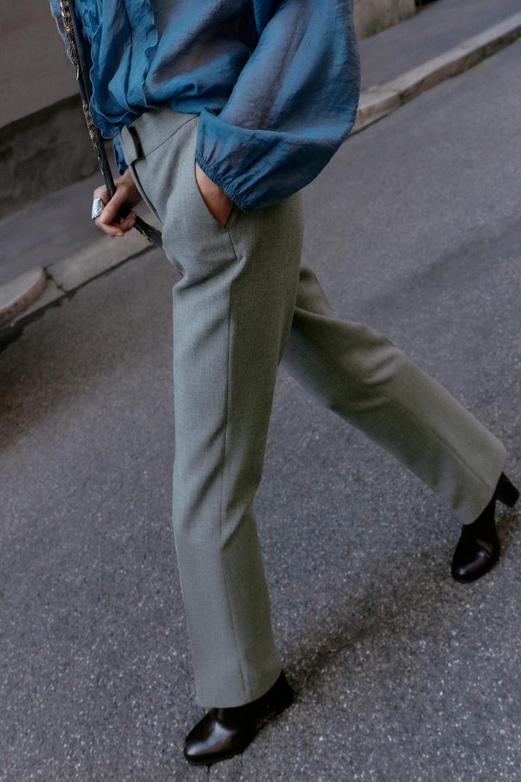 Pantalon taille basse avec poches avant et fausses poches passepoilées à l’arrière. Bas évasé. Fermeture avant par zip, bouton intérieur et crochet.