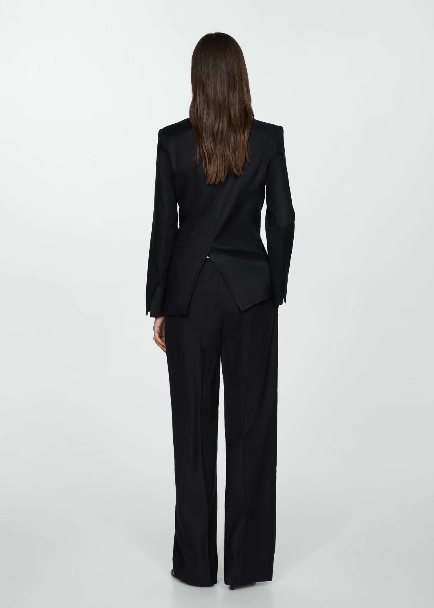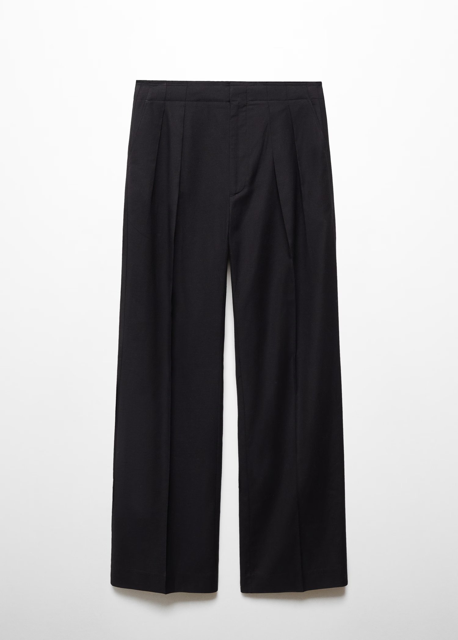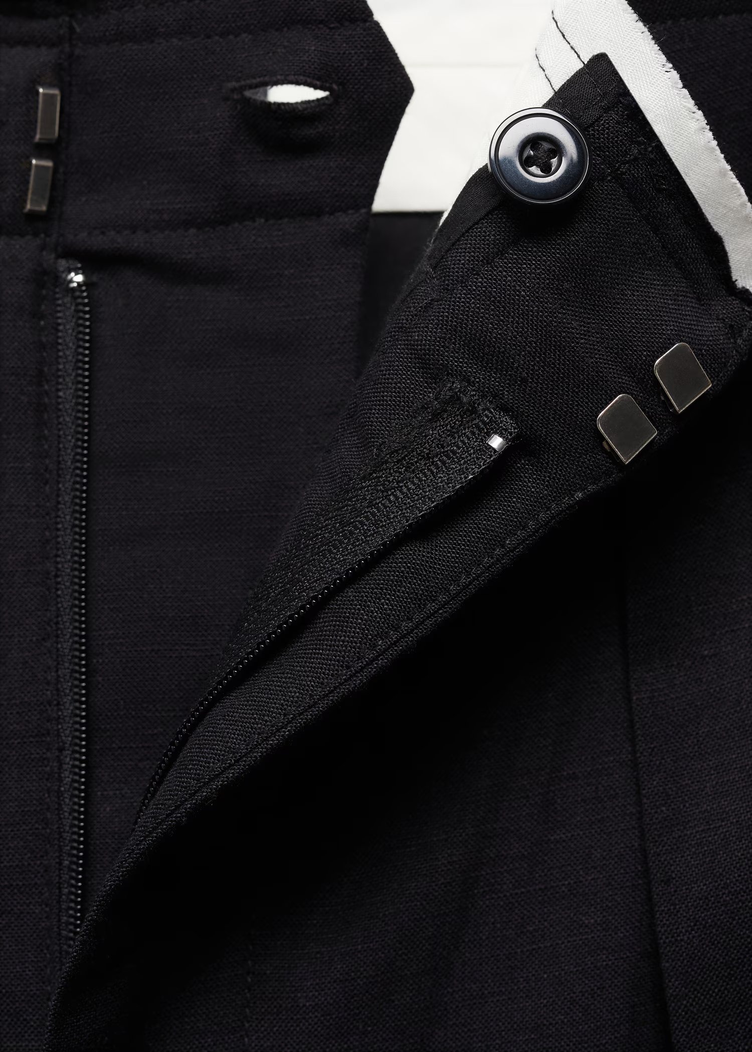 Tissu en lin mélangé. Tissu fluide. Design droit. Design long. Fermeture Éclair avec agrafe et bouton dissimulés. Deux poches latérales. Deux poches passepoilées à l’arrière. Pinces. Bordure contrastante.