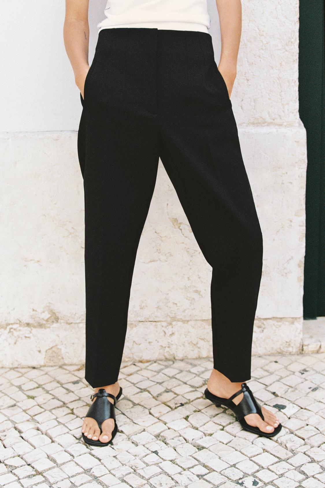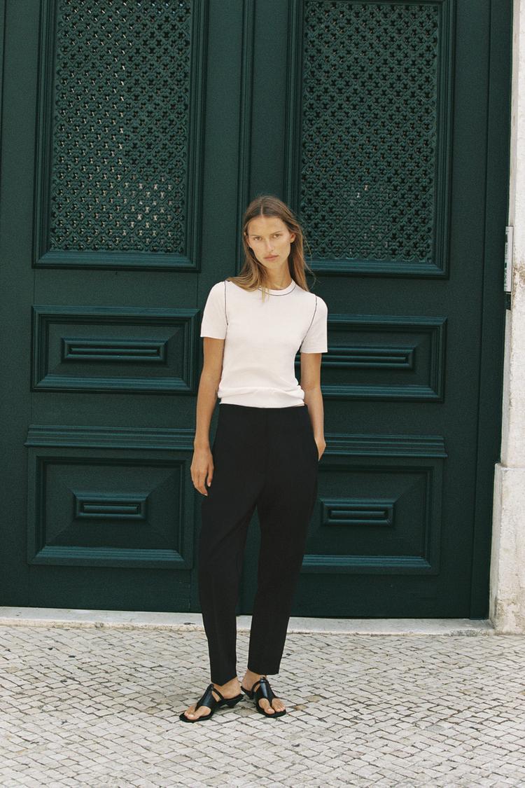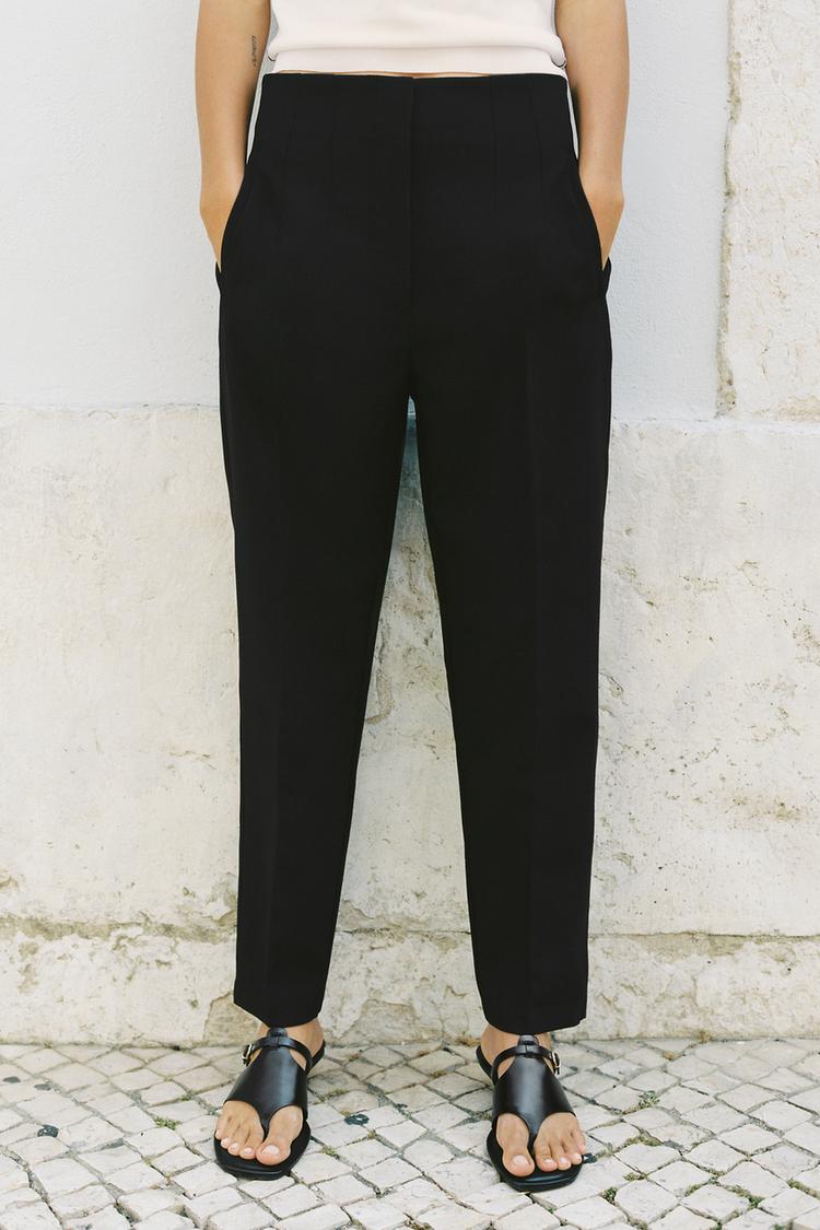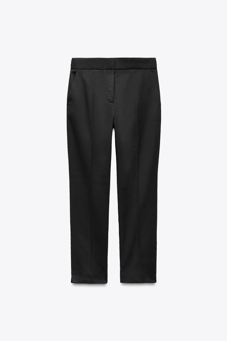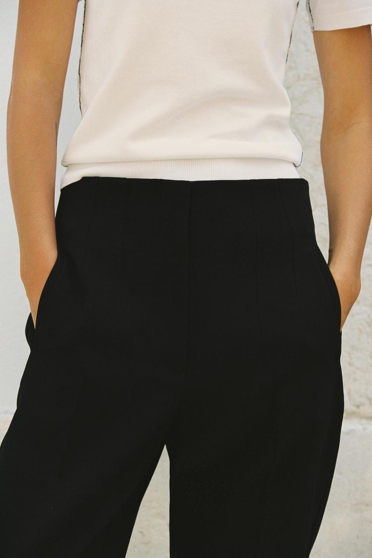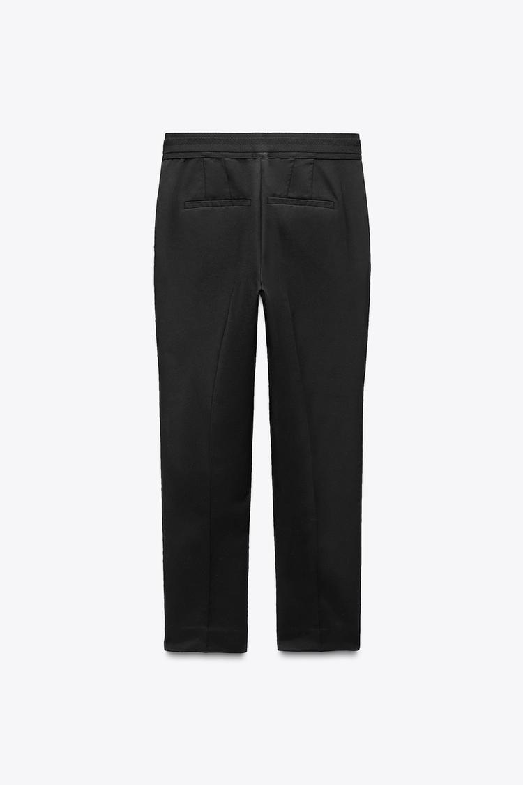 Pantalon taille normale avec taille élastiquée au dos. Poches avant et fausses poches passepoilées à l’arrière. Ourlet avec fentes latérales. Fermeture avant par zip, bouton intérieur et crochet.