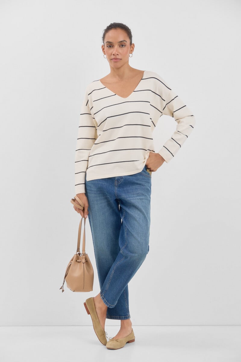 – Pull à col en V. – Manches longues légèrement tombantes. – Coupe droite. – Fentes latérales.