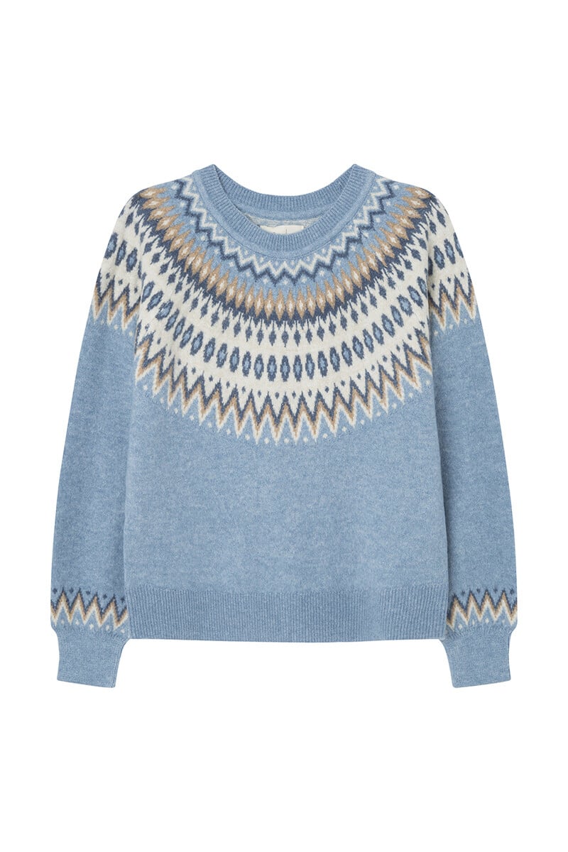 Pull à manches longues, col rond, avec bordures jacquard multicolores positionnées sur le devant, le dos et les poignets, avec bords-côtes au col, aux poignets et à la base.