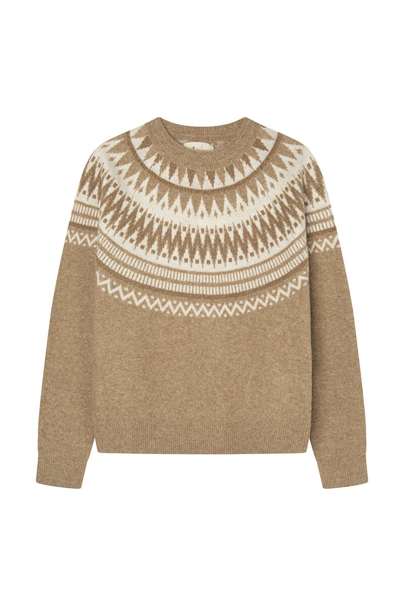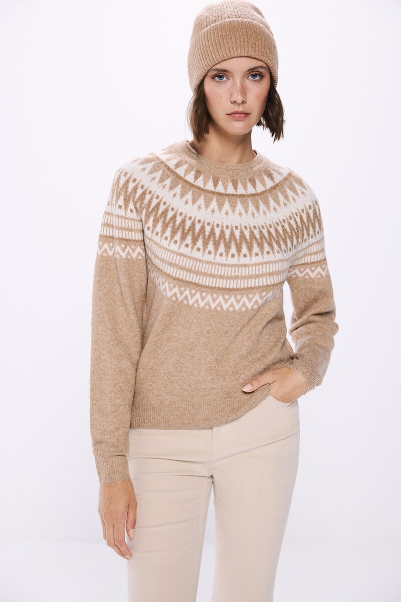 Pull à manches longues, col rond, avec bordures jacquard positionnées devant et dos, avec bords-côtes au col, aux poignets et à la base.