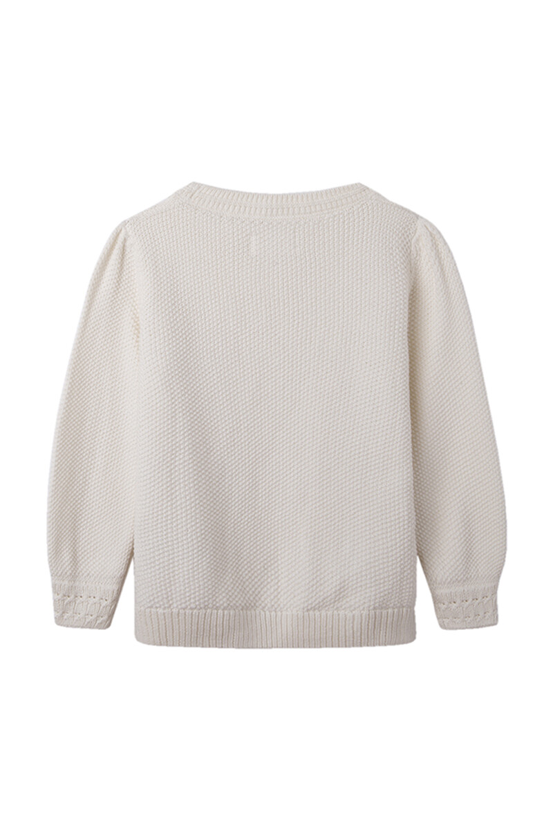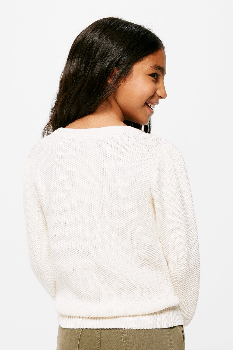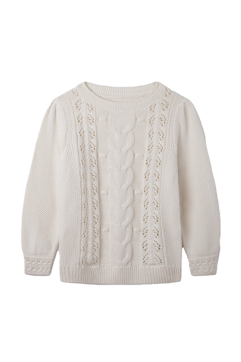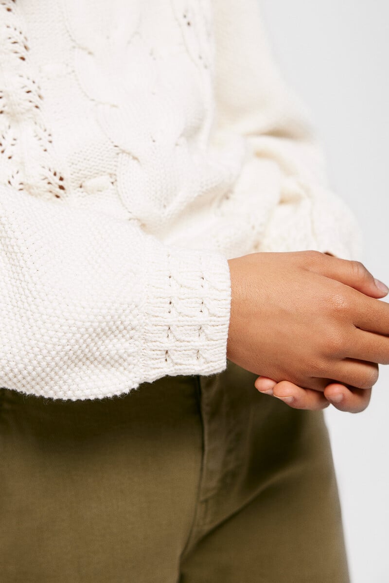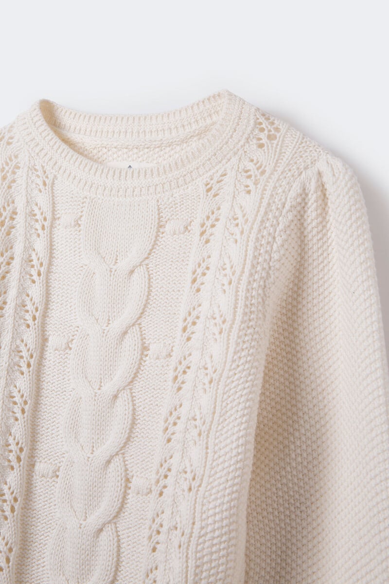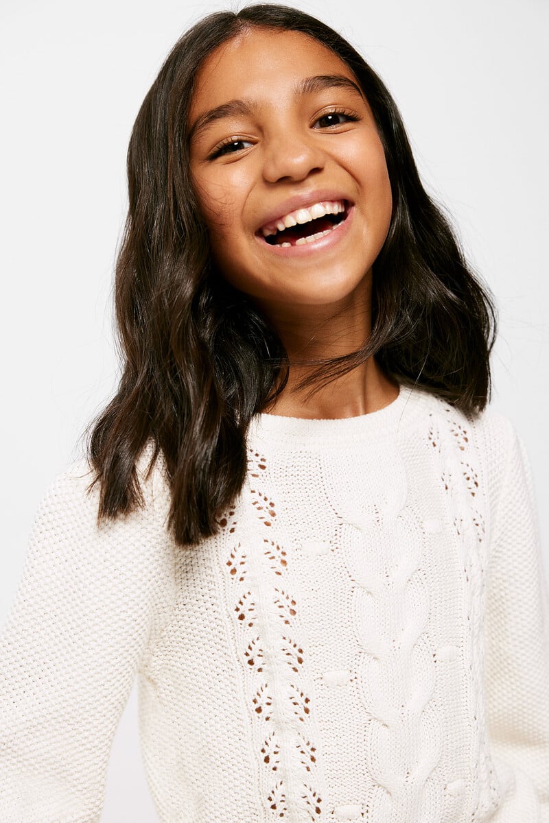 Pull à manches longues 100 % coton pour fille. Col rond. Maille torsadée sur le devant avec détail ajouré. Poignets et ourlet élastiqués.