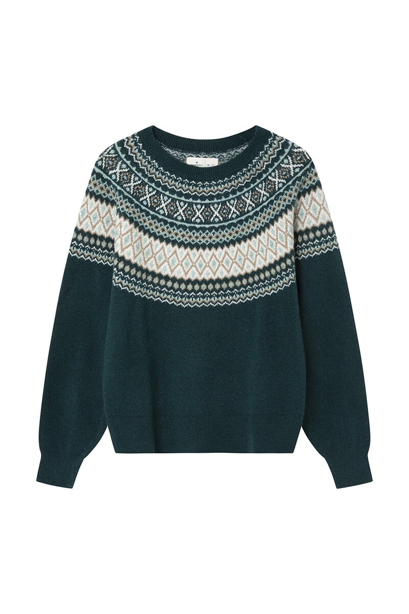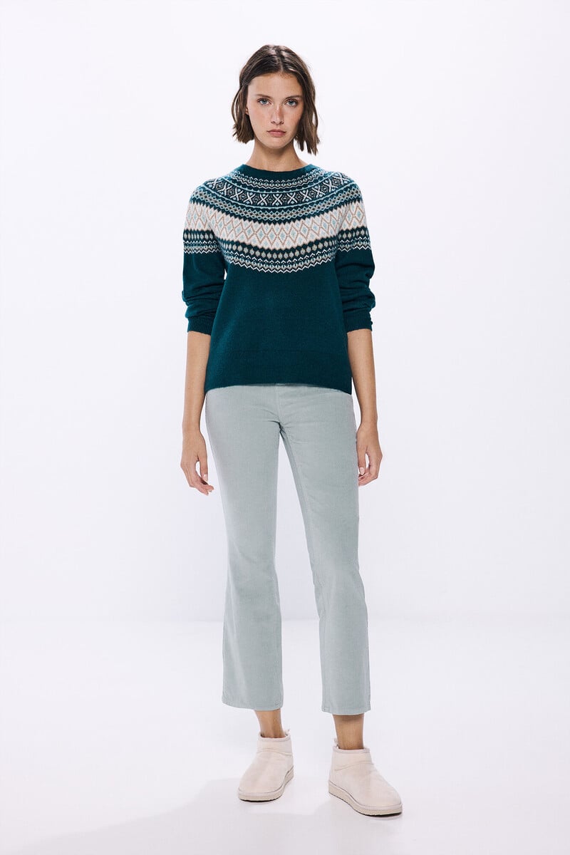 Pull à manches longues, col rond, avec bordures jacquard multicolores positionnées sur le devant, le dos et les poignets, avec bords-côtes au col, aux poignets et à la base.