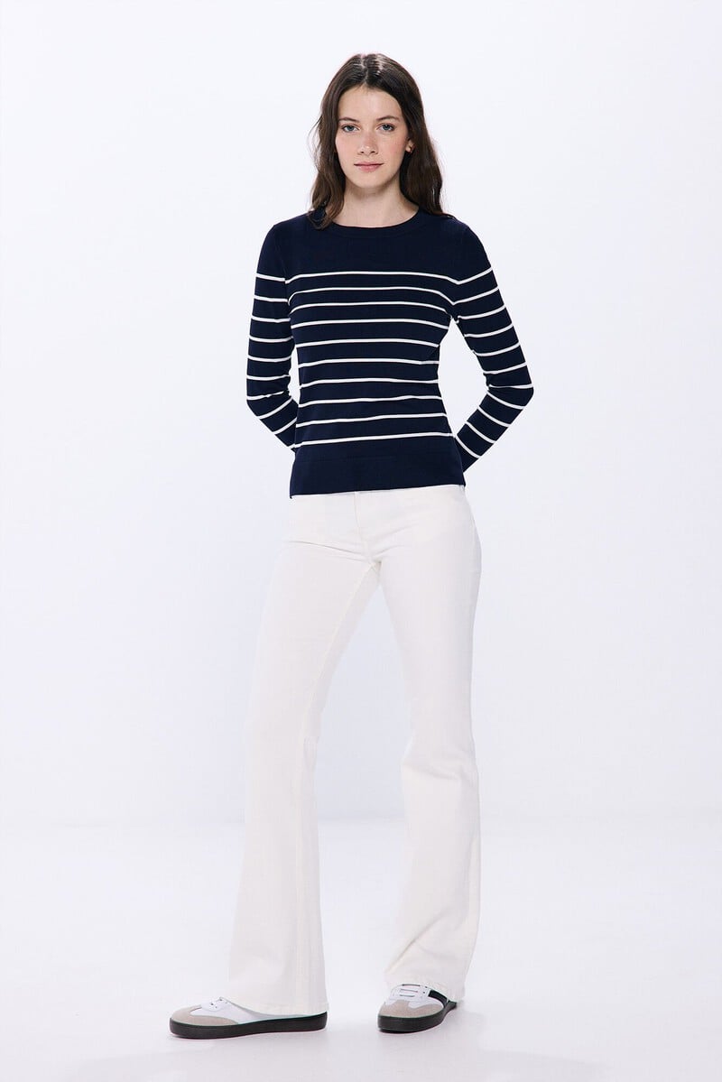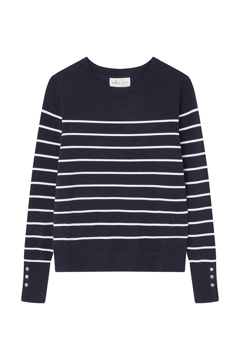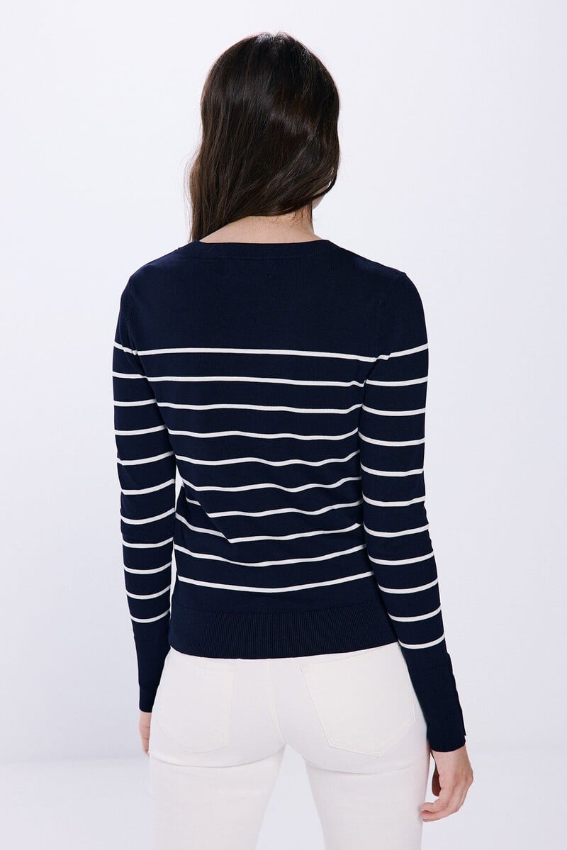 Pull léger à manches longues et coupe ajustée, col rond, détails de boutons aux poignets, col, poignets et ourlet côtelés.