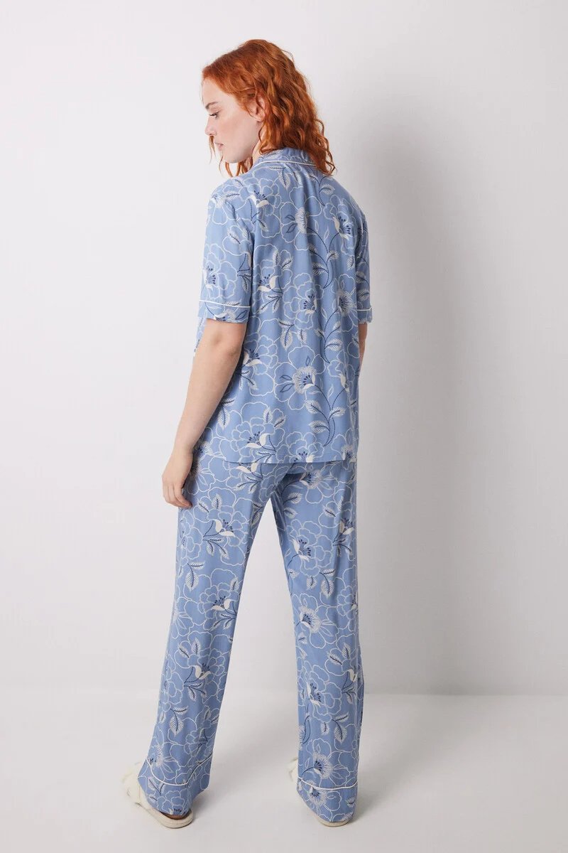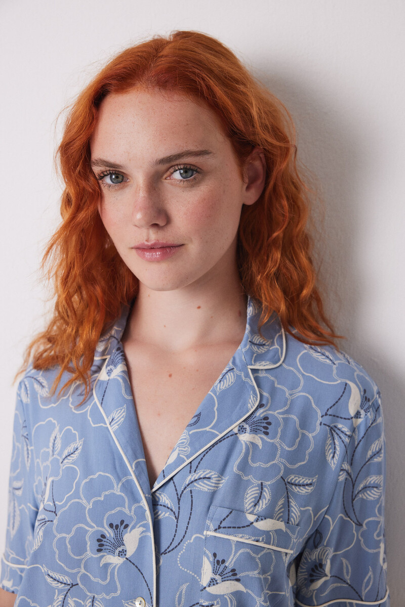 Pyjama chemise en viscose bleue à imprimé floral. Idéal pour un confort optimal et une allure élégante à la maison.