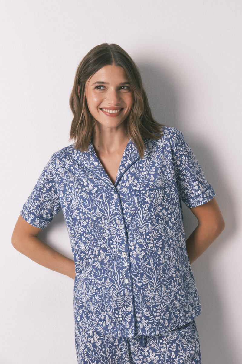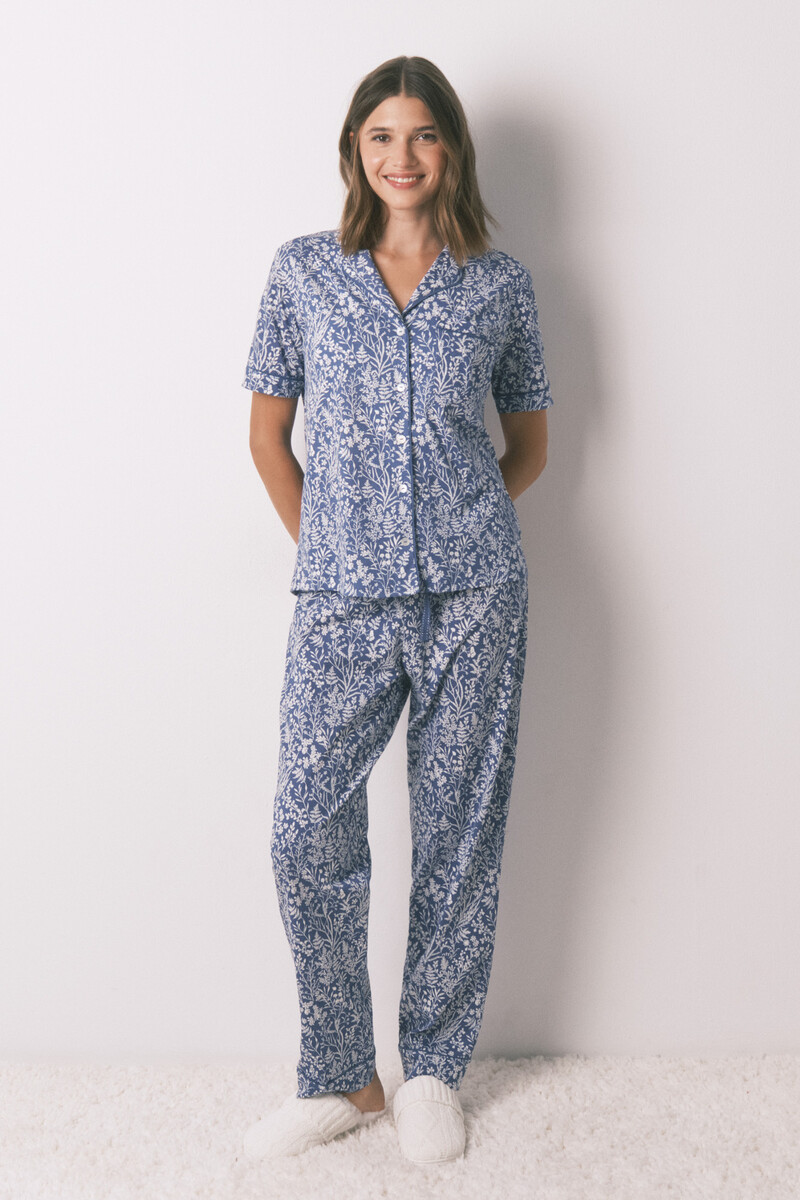 Ensemble pyjama classique composé d’un haut à manches courtes et d’un pantalon long, orné d’un imprimé floral intégral en coton simple. Le haut présente un col chemise et des boutons contrastants, ainsi qu’une poche poitrine ou une poche poitrine avec des détails passepoilés contrastants. Le pantalon possède une taille élastiquée ajustable par un cordon de serrage contrastant et des pompons. Idéal pour dormir ou se détendre à la maison