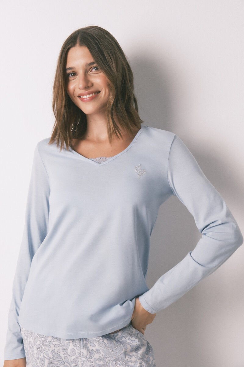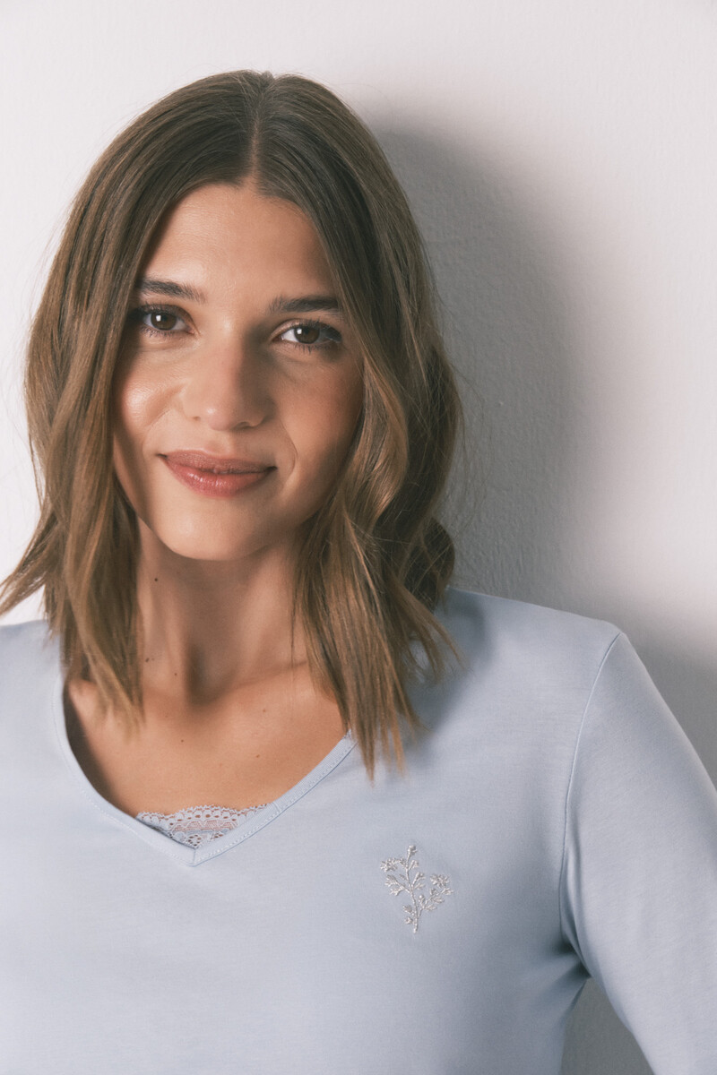 – Haut uni à col V avec détails en dentelle ton sur ton et broderie sur la poitrine.