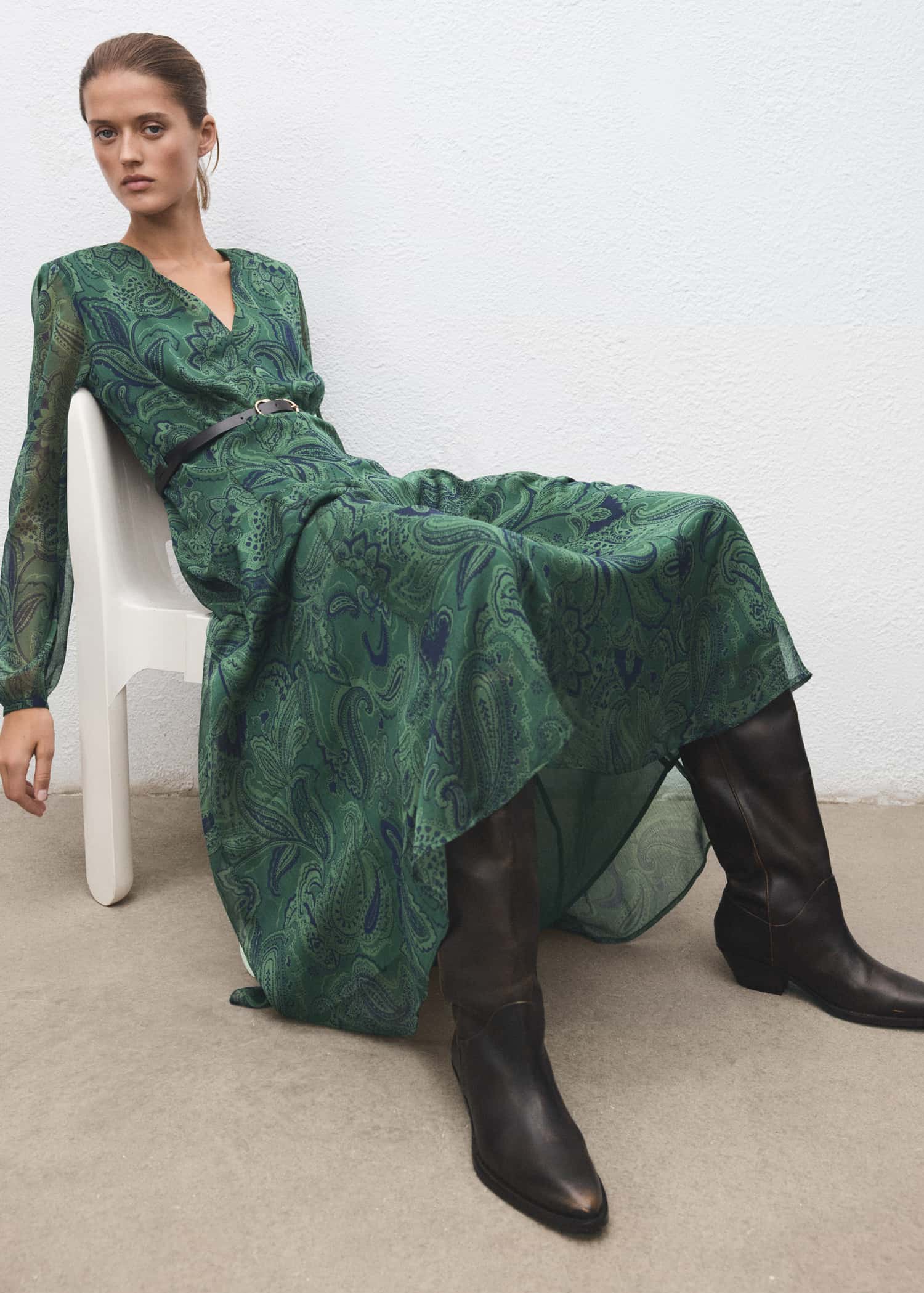 Imprimé Cachemire. Design long. Design évasé. Col en V. Manches longues bouffantes. Ceinture avec fermeture à boucle. Fermeture éclair latérale. Doublure intérieure.