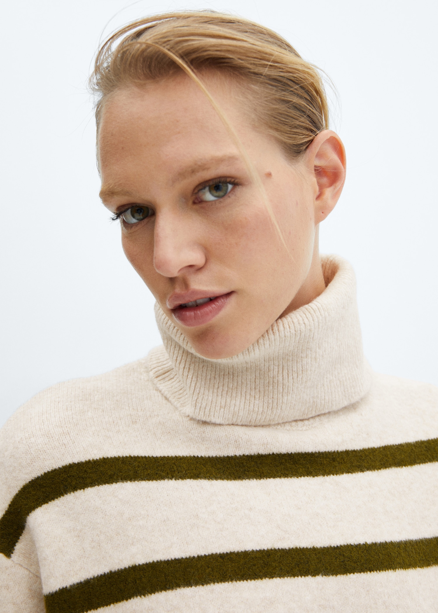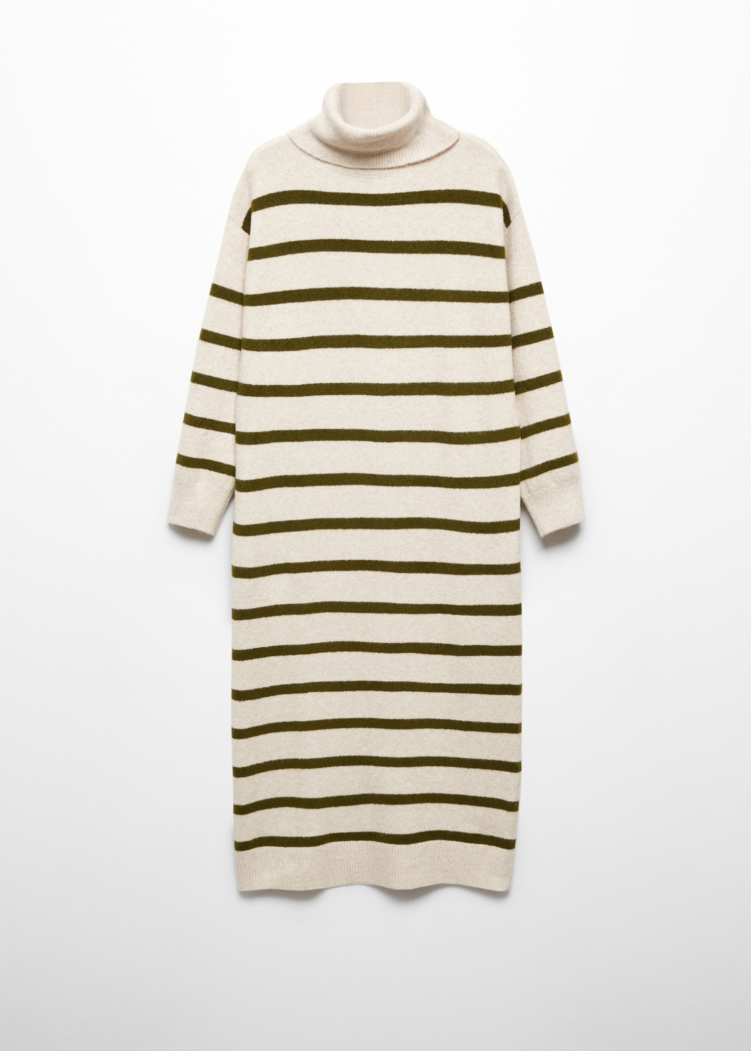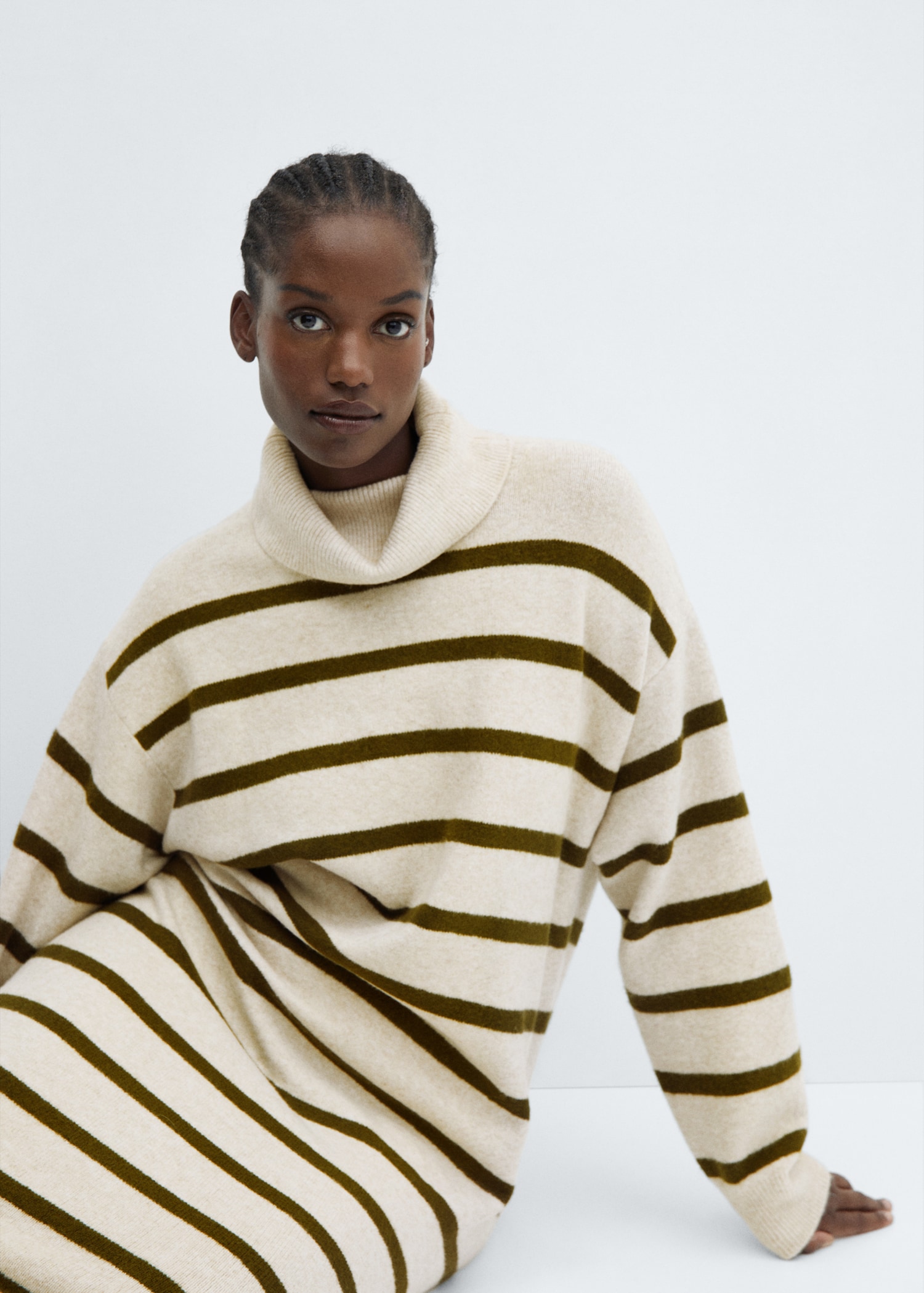 Tissu de laine mélangé. Tissu en grosse maille. Design Droit. Design long. Motif à rayures. Col roulé. Manche longue. Sans fermeture.
