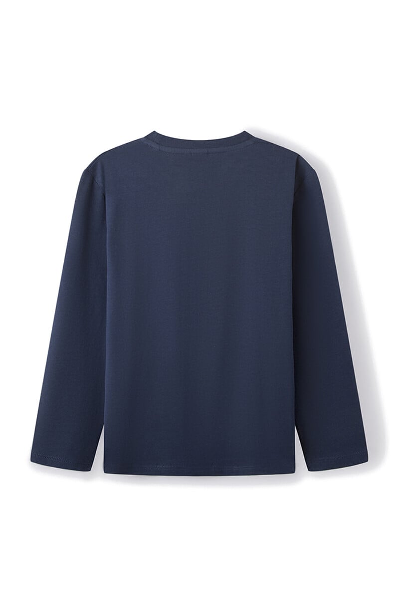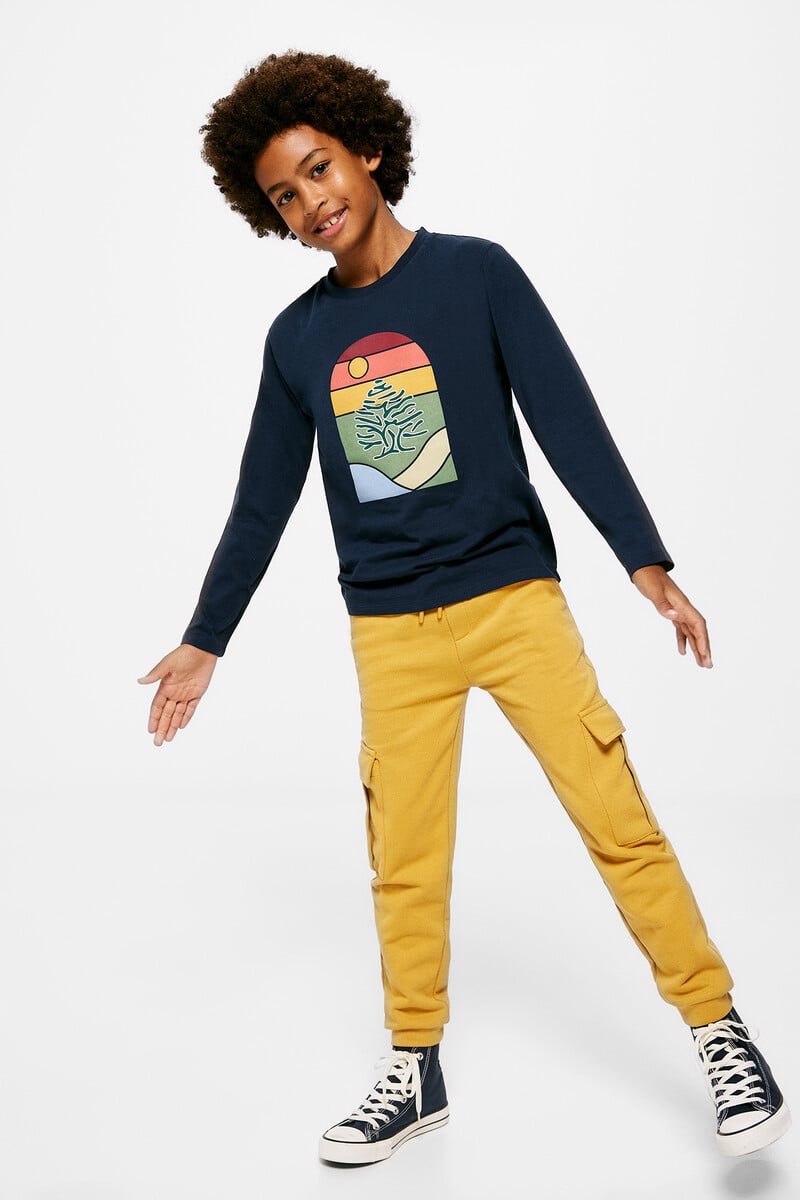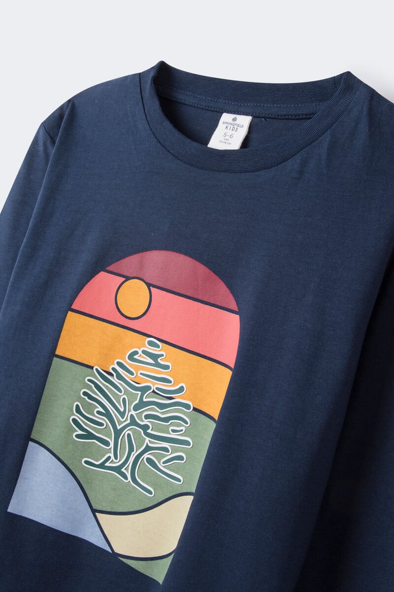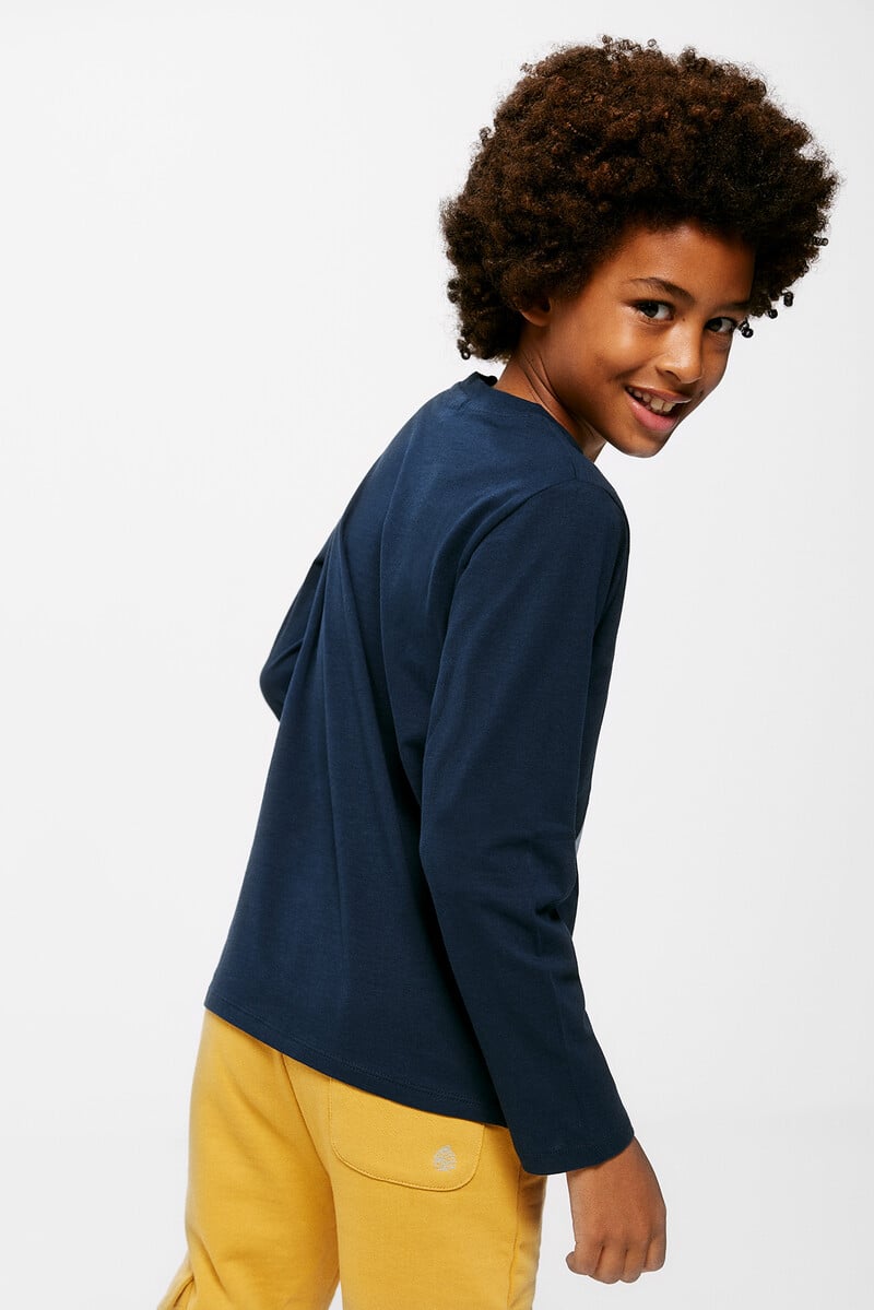 T-shirt à manches longues 100% coton pour garçon. Imprimé graphique coloré haute densité sur le devant. Coupe régulière. Col rond.