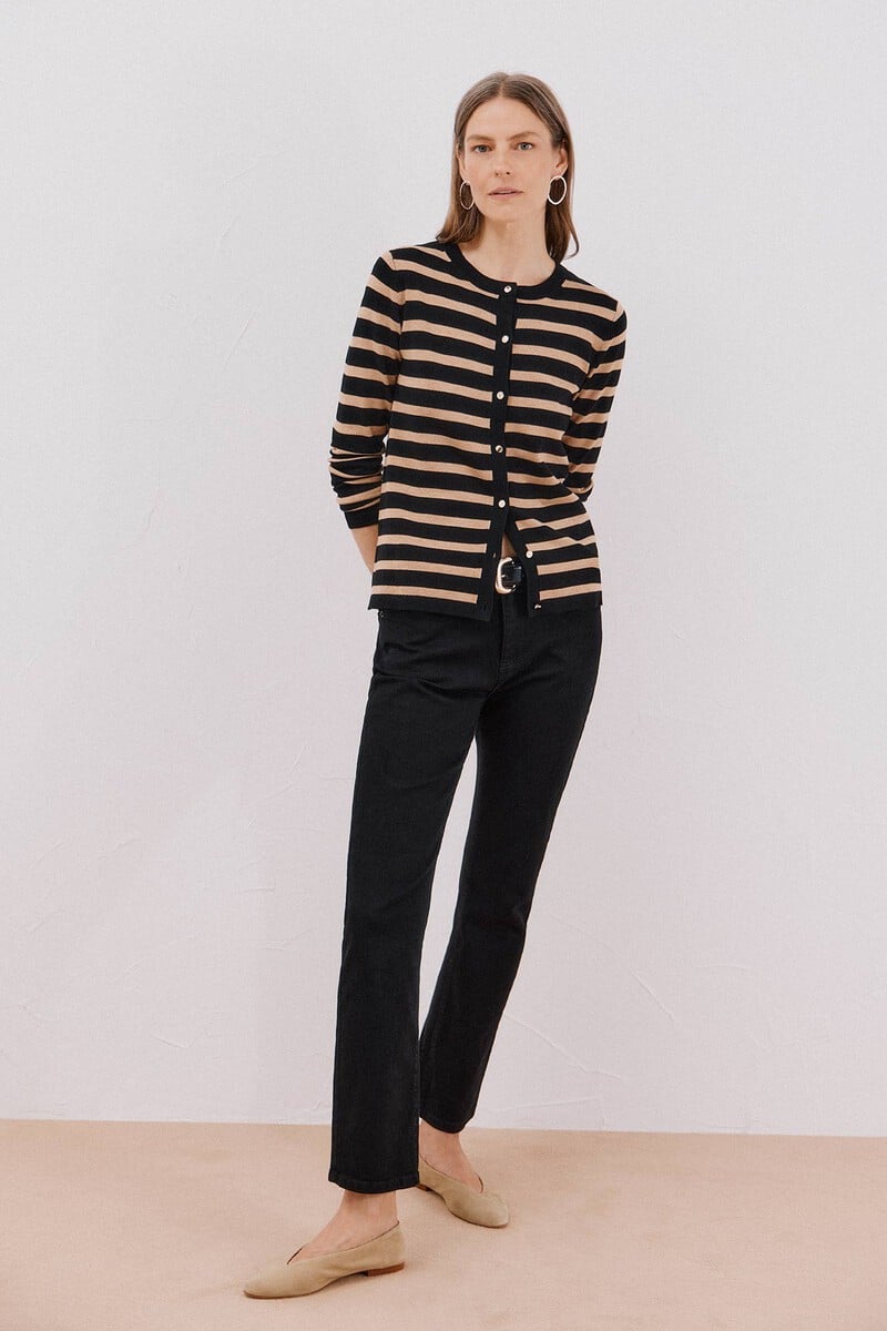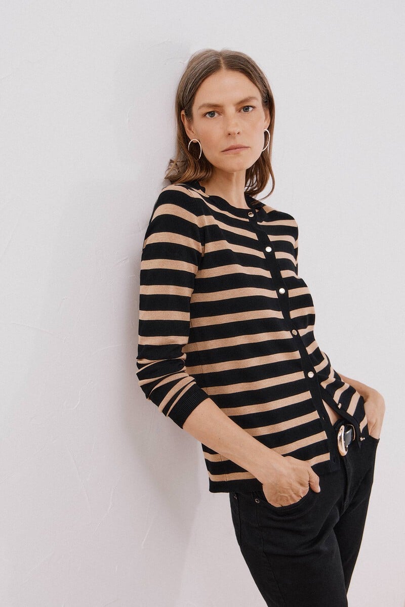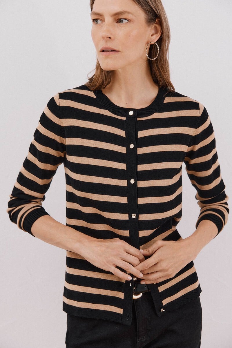 – Gilet en maille fine à rayures métalliques.