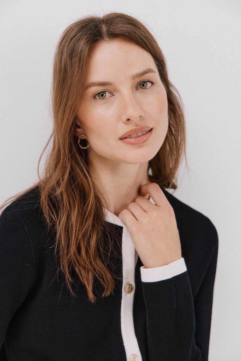 – Veste en maille. – Col rond. – Manches longues. – Coupe droite. – Bord-côtes. – Fermeture par boutons métalliques.