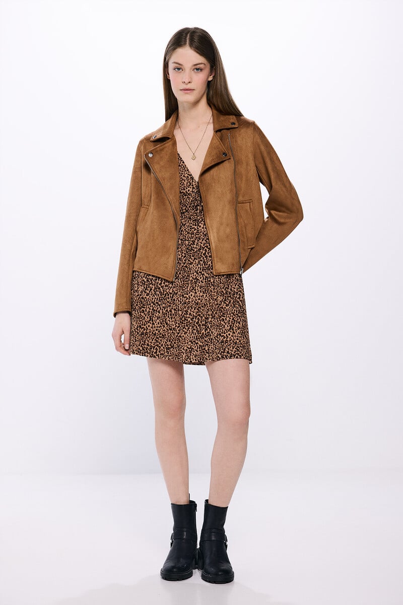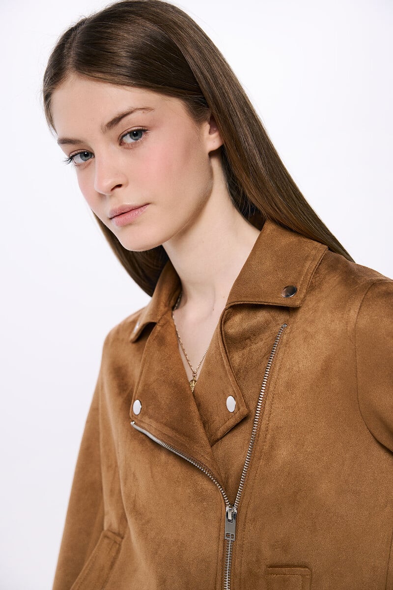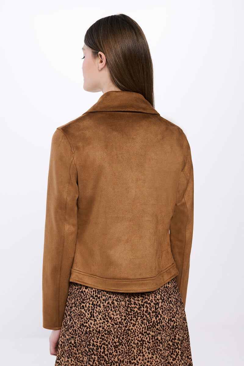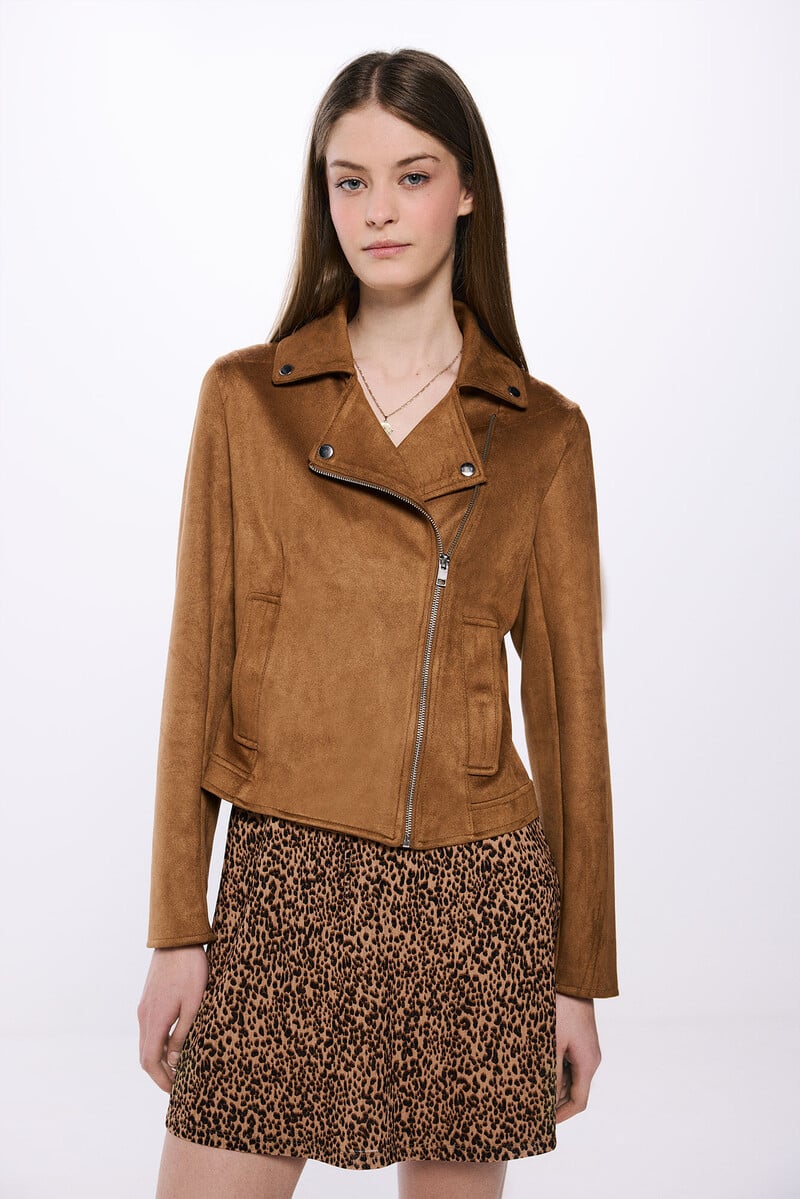 Veste courte, avec col chemise à revers, avec poches sur les côtés, fermeture zippée en diagonale sur le devant et détails métalliques.